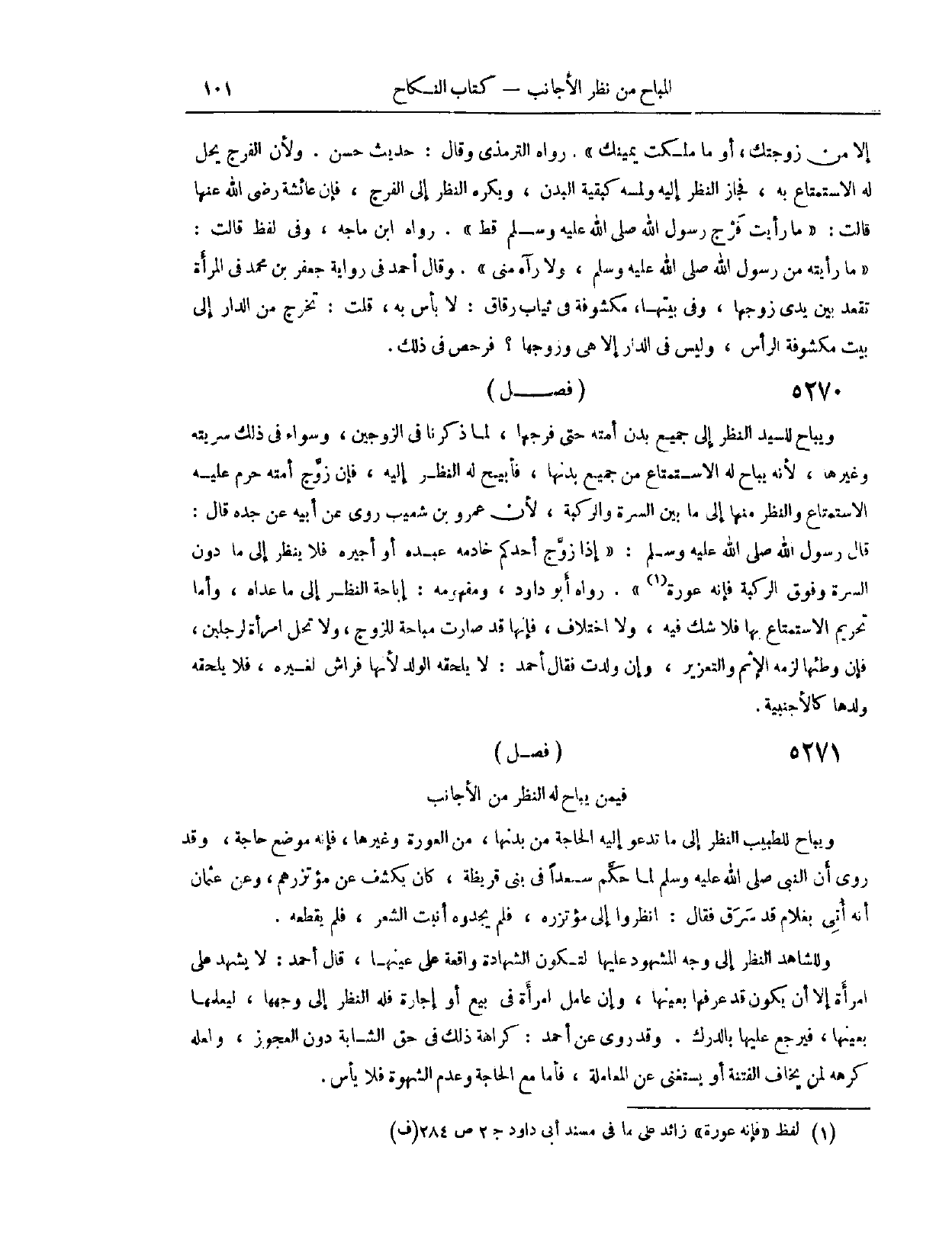 (٥٣٣٤) فَصْلٌ: وَيُبَاحُ لِلسَّيِّدِ النَّظَرُ إلَى جَمِيعِ بَدَنِ أَمَتِهِ حَتَّى فَرْجِهَا لِمَا ذَكَرْنَا فِي الزَّوْجَيْنِ، وَسَوَاءٌ فِي ذَلِكَ سُرِّيَّتُهُ وَغَيْرُهَا؛ لِأَنَّهُ مُبَاحٌ لَهُ الِاسْتِمْتَاعُ مِنْ جَمِيعِ بَدَنِهَا، فَأُبِيحَ لَهُ النَّظَرُ إلَيْهِ فَإِنْ زَوَّجَ أَمَتَهُ حَرُمَ عَلَيْهِ الِاسْتِمْتَاعُ، وَالنَّظَرُ مِنْهَا إلَى مَا بَيْنَ السُّرَّةِ وَالرُّكْبَةِ؛ لِأَنَّ عَمْرَو بْنَ شُعَيْبٍ رَوَى عَنْ أَبِيهِ، عَنْ جَدِّهِ، قَالَ: قَالَ رَسُولُ اللَّهِ - صَلَّى اللَّهُ عَلَيْهِ وَسَلَّمَ - «إذَا زَوَّجَ أَحَدُكُمْ خَادِمَهُ عَبْدَهُ أَوْ أَجِيرَهُ، فَلَا يَنْظُرْ إلَى مَا دُونَ السُّرَّةِ وَفَوْقَ الرُّكْبَةِ، فَإِنَّهُ عَوْرَةٌ» . رَوَاهُ أَبُو دَاوُد