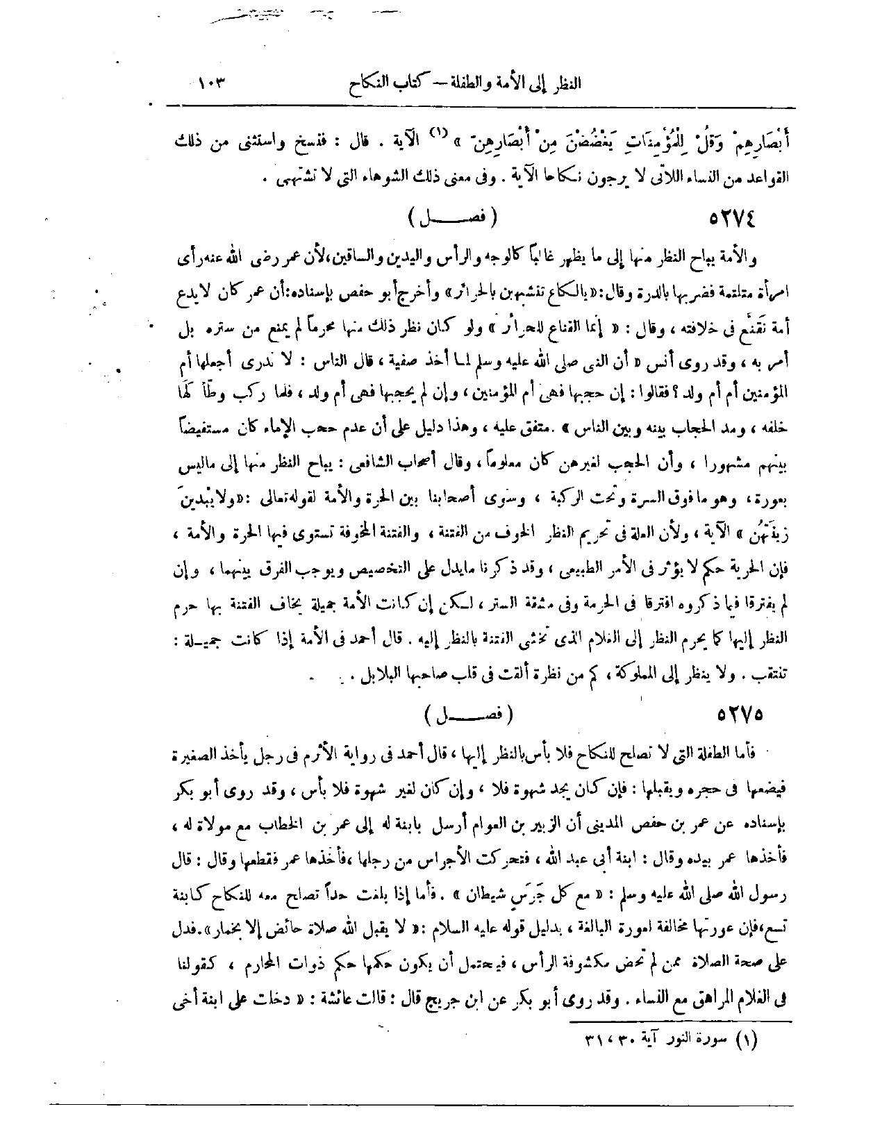 (٥٣٣٨) فَصْلٌ: وَالْأَمَةُ يُبَاحُ النَّظَرُ مِنْهَا إلَى مَا يَظْهَرُ غَالِبًا، كَالْوَجْهِ، وَالرَّأْسِ، وَالْيَدَيْنِ، وَالسَّاقَيْنِ؛ لِأَنَّ عُمَرَ - رَضِيَ اللَّهُ عَنْهُ - رَأَى أَمَةً مُتَلَثِّمَةً فَضَرَبَهَا بِالدِّرَّةِ وَقَالَ: يَا لَكَاعِ، تَتَشَبَّهِينَ بِالْحَرَائِرِ. وَرَوَى أَبُو حَفْصٍ بِإِسْنَادِهِ، أَنَّ عُمَرَ كَانَ لَا يَدَعُ أَمَةً تَقَنَّعُ فِي خِلَافَتِهِ، وَقَالَ: إنَّمَا الْقِنَاعُ لِلْحَرَائِرِ. وَلَوْ كَانَ نَظَرُ ذَلِكَ مِنْهَا مُحَرَّمًا لَمْ يَمْنَعْ مِنْ سَتْرِهِ، بَلْ أَمَرَ بِهِ وَقَدْ رَوَى أَنَسٌ «أَنَّ النَّبِيَّ - صَلَّى اللَّهُ عَلَيْهِ وَسَلَّمَ - لَمَّا أَخَذَ صَفِيَّةَ قَالَ النَّاسُ: لَا نَدْرِي، أَجَعَلَهَا أُمَّ الْمُؤْمِنِينَ، أَمْ أُمَّ وَلَدٍ؟ فَقَالُوا: إنْ حَجَبَهَا فَهِيَ أُمُّ الْمُؤْمِنِينَ، وَإِنْ لَمْ يَحْجُبْهَا فَهِيَ أُمُّ وَلَدٍ. فَلَمَّا رَكِبَ، وَطَّأَ لَهَا خَلْفَهُ، وَمَدَّ الْحِجَابَ بَيْنَهُ وَبَيْنَ النَّاسِ» مُتَّفَقٌ عَلَيْهِ