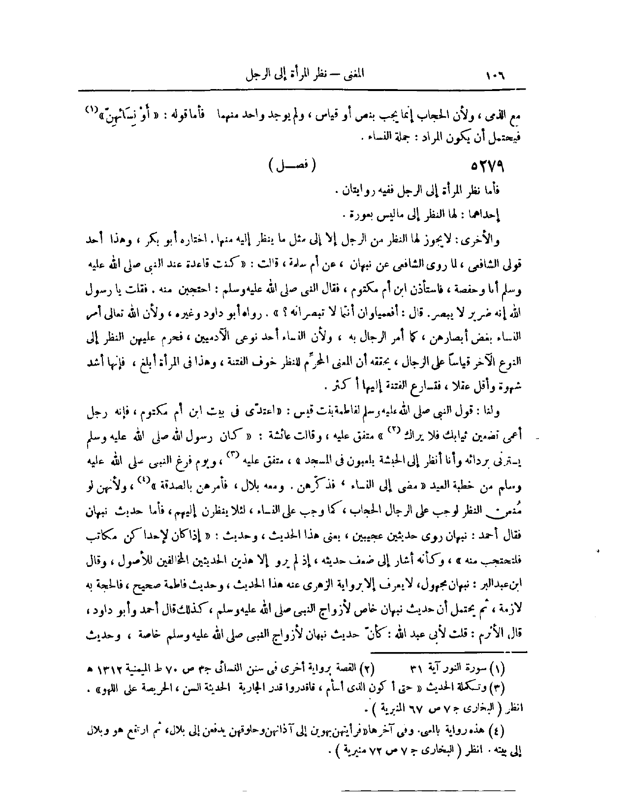 (٥٣٤٣) فَصْلٌ: فَأَمَّا نَظَرُ الْمَرْأَةِ إلَى الرَّجُلِ، فَفِيهِ رِوَايَتَانِ، إحْدَاهُمَا: لَهَا النَّظَرُ إلَى مَا لَيْسَ بِعَوْرَةٍ. وَالْأُخْرَى: لَا يَجُوزُ لَهَا النَّظَرُ مِنْ الرَّجُلِ إلَّا إلَى مِثْلِ مَا يَنْظُرُ إلَيْهِ مِنْهَا. اخْتَارَهُ أَبُو بَكْرٍ وَهَذَا أَحَدُ قَوْلَيْ الشَّافِعِيِّ لِمَا رَوَى الزُّهْرِيُّ عَنْ نَبْهَانَ عَنْ أُمِّ سَلَمَةَ قَالَتْ: «كُنْت قَاعِدَةً عِنْدَ النَّبِيِّ - صَلَّى اللَّهُ عَلَيْهِ وَسَلَّمَ - أَنَا وَحَفْصَةُ فَاسْتَأْذَنَ ابْنُ أُمِّ مَكْتُومٍ فَقَالَ النَّبِيُّ - صَلَّى اللَّهُ عَلَيْهِ وَسَلَّمَ -: احْتَجِبْنَ مِنْهُ فَقُلْت: يَا رَسُولَ اللَّهِ، إنَّهُ ضَرِيرٌ لَا يُبْصِرُ قَالَ: أَفَعَمْيَاوَانِ أَنْتُمَا لَا تُبْصِرَانِهِ» رَوَاهُ أَبُو دَاوُد، وَغَيْرُهُ؛ وَلِأَنَّ اللَّهَ تَعَالَى أَمَرَ النِّسَاءَ بِغَضِّ أَبْصَارِهِنَّ، كَمَا أَمَرَ الرِّجَالَ بِهِ؛ وَلِأَنَّ النِّسَاءَ أَحَدُ نَوْعَيْ الْآدَمِيِّينَ، فَحَرُمَ، عَلَيْهِنَّ النَّظَرُ إلَى النَّوْعِ الْآخَرِ قِيَاسًا عَلَى الرِّجَالِ، يُحَقِّقُهُ أَنَّ الْمَعْنَى الْمُحَرِّمَ لِلنَّظَرِ خَوْفُ الْفِتْنَةِ، وَهَذَا فِي الْمَرْأَةِ أَبْلَغُ، فَإِنَّهَا أَشَدُّ شَهْوَةً، وَأَقَلُّ عَقْلًا، فَتُسَارِعُ الْفِتْنَةُ إلَيْهَا أَكْثَرَ. وَلَنَا «، قَوْلُ النَّبِيِّ - صَلَّى اللَّهُ عَلَيْهِ وَسَلَّمَ - لَفَاطِمَةَ بِنْتِ قَيْسٍ: اعْتَدِّي فِي بَيْتِ ابْنِ أُمِّ مَكْتُومٍ، فَإِنَّهُ رَجُلٌ أَعْمَى، تَضَعِينَ ثِيَابَكَ فَلَا يَرَاكِ» مُتَّفَقٌ عَلَيْهِ