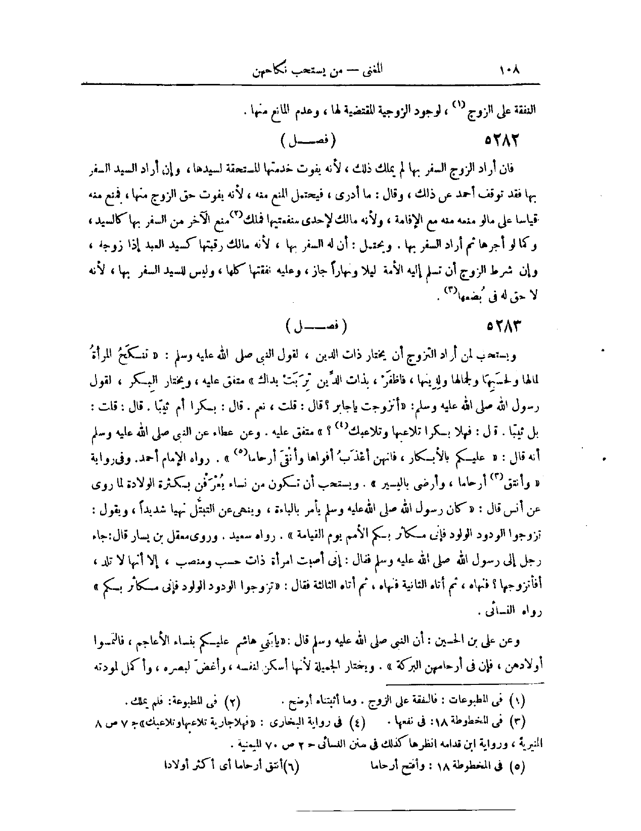 (٥٣٤٧) فَصْلٌ: وَيُسْتَحَبُّ لِمَنْ أَرَادَ التَّزَوُّجَ أَنْ يَخْتَارَ ذَاتَ الدِّينِ لِقَوْلِ النَّبِيِّ - صَلَّى اللَّهُ عَلَيْهِ وَسَلَّمَ - «تُنْكَحُ الْمَرْأَةُ لِمَالِهَا، وَلِحَسَبِهَا، وَلِجَمَالِهَا وَلِدِينِهَا، فَاظْفَرْ بِذَاتِ الدِّينِ تَرِبَتْ يَدَاك» مُتَّفَقٌ عَلَيْهِ وَيَخْتَارُ الْبِكْرَ لِقَوْلِ رَسُولِ اللَّهِ - صَلَّى اللَّهُ عَلَيْهِ وَسَلَّمَ -: «أَتَزَوَّجْت يَا جَابِرُ؟ قَالَ: قُلْت: نَعَمْ قَالَ: بِكْرًا أَمْ ثَيِّبًا؟ قَالَ: قُلْت: بَلْ ثَيِّبًا قَالَ: فَهَلَّا بِكْرًا تُلَاعِبُهَا وَتُلَاعِبُك؟» مُتَّفَقٌ عَلَيْهِ وَعَنْ عَطَاءٍ عَنْ النَّبِيِّ - صَلَّى اللَّهُ عَلَيْهِ وَسَلَّمَ - أَنَّهُ قَالَ: «عَلَيْكُمْ بِالْأَبْكَارِ، فَإِنَّهُنَّ أَعْذَبُ أَفْوَاهًا وَأَنْقَى أَرْحَامًا» رَوَاهُ الْإِمَامُ أَحْمَدُ وَفِي رِوَايَةٍ: «وَأَنْتَقُ أَرْحَامًا وَأَرْضَى بِالْيَسِيرِ» وَيُسْتَحَبُّ أَنْ تَكُونَ مِنْ نِسَاءٍ يُعْرَفْنَ بِكَثْرَةِ الْوِلَادَةِ لِمَا رُوِيَ عَنْ أَنَسٍ قَالَ: «كَانَ رَسُولُ اللَّهِ - صَلَّى اللَّهُ عَلَيْهِ وَسَلَّمَ - يَأْمُرُ بِالْبَاءَةِ، وَيَنْهَى عَنْ التَّبَتُّلِ نَهْيًا شَدِيدًا، وَيَقُولُ: تَزَوَّجُوا الْوَدُودَ الْوَلُودَ، فَإِنِّي مُكَاثِرٌ بِكُمْ الْأُمَمَ يَوْمَ الْقِيَامَةِ» رَوَاهُ سَعِيدٌ