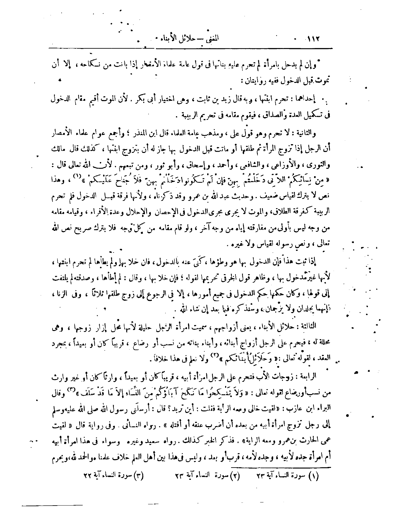 الثَّالِثَةُ: حَلَائِلُ الْأَبْنَاءِ، يَعْنِي أَزْوَاجَهُمْ، سُمِّيَتْ امْرَأَةُ الرَّجُلِ حَلِيلَتَهُ لِأَنَّهَا مَحَلُّ إزَارِ زَوْجِهَا، وَهِيَ مُحَلَّلَةٌ لَهُ، فَيَحْرُمُ عَلَى الرَّجُلِ أَزْوَاجُ أَبْنَائِهِ، وَأَبْنَاءُ بَنَاتِهِ، مِنْ نَسَبٍ أَوْ رَضَاعٍ، قَرِيبًا كَانَ أَوْ بَعِيدًا بِمُجَرَّدِ الْعَقْدِ لِقَوْلِهِ تَعَالَى: {وَحَلائِلُ أَبْنَائِكُمُ} [النساء: ٢٣] وَلَا نَعْلَمُ فِي هَذَا خِلَافًا. الرَّابِعَةُ: زَوْجَاتُ الْأَبِ، فَتَحْرُمُ عَلَى الرَّجُلِ امْرَأَةُ أَبِيهِ، قَرِيبًا كَانَ أَوْ بَعِيدًا، وَارِثًا كَانَ أَوْ غَيْرَ وَارِثٍ، مِنْ نَسَبٍ أَوْ رَضَاعٍ لِقَوْلِهِ تَعَالَى: {وَلا تَنْكِحُوا مَا نَكَحَ آبَاؤُكُمْ مِنَ النِّسَاءِ إِلا مَا قَدْ سَلَفَ} [النساء: ٢٢] وَقَالَ الْبَرَاءُ بْنُ عَازِبٍ: «لَقِيت خَالِي، وَمَعَهُ الرَّايَةُ، فَقُلْت: أَيْنَ تُرِيدُ؟ قَالَ: أَرْسَلَنِي رَسُولُ اللَّهِ - صَلَّى اللَّهُ عَلَيْهِ وَسَلَّمَ - إلَى رَجُلٍ تَزَوَّجَ امْرَأَةَ أَبِيهِ مِنْ بَعْدِهِ أَنْ أَضْرِبَ عُنُقَهُ أَوْ أَقْتُلَهُ» رَوَاهُ النَّسَائِيّ. وَفِي رِوَايَةٍ قَالَ: لَقِيت عَمِّي الْحَارِثَ بْنَ عَمْرٍو، وَمَعَهُ الرَّايَةُ فَذَكَرَ الْخَبَرَ كَذَلِكَ. رَوَاهُ سَعِيدٌ وَغَيْرُهُ