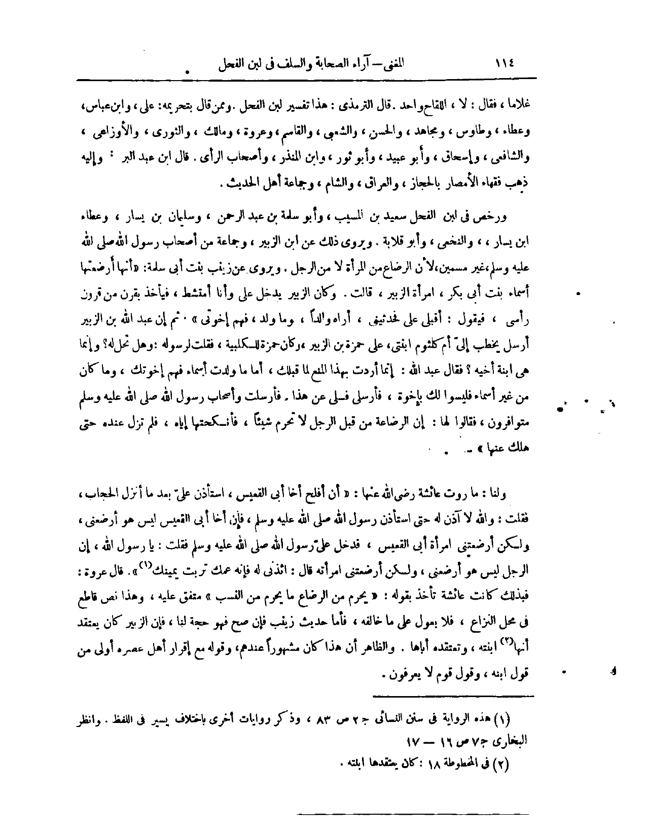 وَيُرْوَى ذَلِكَ عَنْ ابْنِ الزُّبَيْرِ وَجَمَاعَةٍ مِنْ أَصْحَابِ رَسُولِ اللَّهِ - صَلَّى اللَّهُ عَلَيْهِ وَسَلَّمَ - غَيْرِ مُسَمِّينَ؛ لِأَنَّ الرَّضَاعَ مِنْ الْمَرْأَةِ لَا مِنْ الرَّجُلِ. وَيُرْوَى عَنْ زَيْنَبَ بِنْتِ أَبِي سَلَمَةَ أَنَّهَا أَرْضَعَتْهَا أَسْمَاءُ بِنْتُ أَبِي بَكْرٍ، امْرَأَةُ الزُّبَيْرِ قَالَتْ: وَكَانَ الزُّبَيْرُ يَدْخُلُ عَلَيَّ وَأَنَا أَمْتَشِطُ، فَيَأْخُذُ بِقَرْنٍ مِنْ قُرُونِ رَأْسِي، فَيَقُولُ: أَقْبِلِي عَلَيَّ فَحَدِّثِينِي. أَرَاهُ وَالِدًا، وَمَا وَلَدَ فَهُمْ إخْوَتِي، ثُمَّ إنَّ عَبْدَ اللَّهِ بْنَ الزُّبَيْرِ أَرْسَلَ إلَيَّ يَخْطُبُ أُمَّ كُلْثُومٍ ابْنَتِي، عَلَى حَمْزَةَ بْنِ الزُّبَيْرِ وَكَانَ حَمْزَةُ لِلْكَلْبِيَّةِ، فَقُلْت لِرَسُولِهِ: وَهَلْ تَحِلُّ لَهُ وَإِنَّمَا هِيَ ابْنَةُ أُخْتِهِ؟ فَقَالَ عَبْدُ اللَّهِ: إنَّمَا أَرَدْت بِهَذَا الْمَنْعَ لِمَا قِبَلَك، أَمَّا مَا وَلَدَتْ أَسْمَاءُ فَهُمْ إخْوَتُك، وَمَا كَانَ مِنْ غَيْرِ أَسْمَاءَ فَلَيْسُوا لَك بِإِخْوَةٍ، فَأَرْسِلِي فَسَلِي عَنْ هَذَا، فَأَرْسَلَتْ فَسَأَلَتْ وَأَصْحَابُ رَسُولِ اللَّهِ - صَلَّى اللَّهُ عَلَيْهِ وَسَلَّمَ - مُتَوَافِرُونَ، فَقَالُوا لَهَا: إنَّ الرَّضَاعَةَ مِنْ قِبَلِ الرَّجُلِ لَا تُحَرِّمُ شَيْئًا فَأَنْكَحَتْهَا إيَّاهُ، فَلَمْ تَزَلْ عِنْدَهُ حَتَّى هَلَكَ عَنْهَا. وَلَنَا