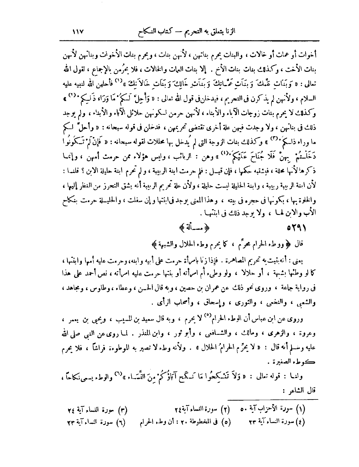 (٥٣٥٥) مَسْأَلَةٌ: قَالَ: (وَوَطْءُ الْحَرَامِ مُحَرِّمٌ كَمَا يُحَرِّمُ وَطْءُ الْحَلَالِ وَالشُّبْهَةِ) يَعْنِي أَنَّهُ يَثْبُتُ بِهِ تَحْرِيمُ الْمُصَاهَرَةِ، فَإِذَا زَنَى بِامْرَأَةٍ حَرُمَتْ عَلَى أَبِيهِ وَابْنِهِ، وَحَرُمَتْ عَلَيْهِ أُمُّهَا وَابْنَتُهَا، كَمَا لَوْ وَطِئَهَا بِشُبْهَةٍ أَوْ حَلَالًا وَلَوْ وَطِئَ أُمَّ امْرَأَتِهِ أَوْ بِنْتَهَا حَرُمَتْ عَلَيْهِ امْرَأَتُهُ نَصَّ أَحْمَدُ عَلَى هَذَا، فِي رِوَايَةِ جَمَاعَةٍ وَرُوِيَ نَحْوُ ذَلِكَ عَنْ عِمْرَانَ بْنِ حُصَيْنٍ وَبِهِ قَالَ الْحَسَنُ وَعَطَاءٌ، وَطَاوُسٌ، وَمُجَاهِدٌ، وَالشَّعْبِيُّ وَالنَّخَعِيُّ، وَالثَّوْرِيُّ، وَإِسْحَاقُ وَأَصْحَابُ الرَّأْيِ، وَرَوَى