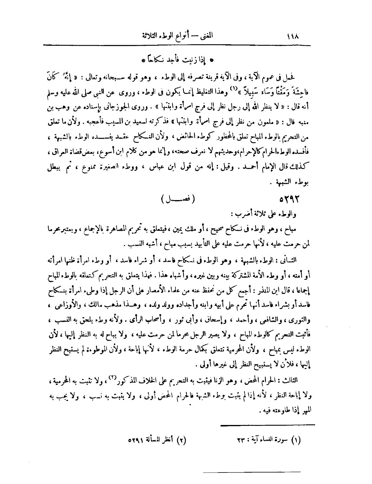 (٥٣٥٦) فَصْلٌ: وَالْوَطْءُ عَلَى ثَلَاثَةِ أَضْرُبٍ؛ مُبَاحٌ، وَهُوَ الْوَطْءُ فِي نِكَاحٍ صَحِيحٍ أَوْ مِلْكِ يَمِينٍ، فَيَتَعَلَّقُ بِهِ تَحْرِيمُ الْمُصَاهَرَةِ بِالْإِجْمَاعِ، وَيُعْتَبَرُ مَحْرَمًا لِمَنْ حَرُمَتْ عَلَيْهِ؛ لِأَنَّهَا حَرُمَتْ عَلَيْهِ عَلَى التَّأْبِيدِ، بِسَبَبٍ مُبَاحٍ، أَشْبَهَ النَّسَبَ. الثَّانِي: الْوَطْءُ بِالشُّبْهَةِ، وَهُوَ الْوَطْءُ فِي نِكَاحٍ فَاسِدٍ، أَوْ شِرَاءٍ فَاسِدٍ، أَوْ وَطْءُ امْرَأَةٍ ظَنَّهَا امْرَأَتَهُ أَوْ أَمَتَهُ، أَوْ وَطْءُ الْأَمَةِ. الْمُشْتَرَكَةِ بَيْنَهُ وَبَيْنَ غَيْرِهِ، وَأَشْبَاهُ هَذَا يَتَعَلَّقُ بِهِ التَّحْرِيمُ كَتَعَلُّقِهِ بِالْوَطْءِ الْمُبَاحِ إجْمَاعًا.
