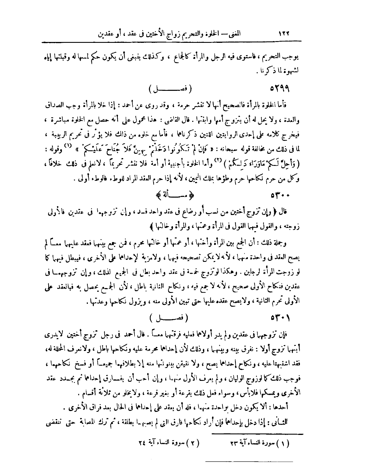 (٥٣٦٣) فَصْلٌ: فَأَمَّا الْخَلْوَةُ بِالْمَرْأَةِ، فَالصَّحِيحُ أَنَّهَا لَا تَنْشُرُ حُرْمَةً. وَقَدْ رُوِيَ عَنْ أَحْمَدَ: إذَا خَلَا بِالْمَرْأَةِ، وَجَبَ الصَّدَاقُ وَالْعِدَّةُ، وَلَا يَحِلُّ لَهُ أَنْ يَتَزَوَّجَ أُمَّهَا وَابْنَتَهَا. قَالَ الْقَاضِي: هَذَا مَحْمُولٌ عَلَى أَنَّهُ حَصَلَ مَعَ الْخَلْوَةِ مُبَاشَرَةٌ، فَيُخَرَّجُ كَلَامُهُ عَلَى إحْدَى الرِّوَايَتَيْنِ اللَّتَيْنِ ذَكَرْنَاهُمَا، فَأَمَّا مَعَ خَلْوَةٍ مِنْ ذَلِكَ، فَلَا يُؤَثِّرُ فِي تَحْرِيمِ الرَّبِيبَةِ؛ لِمَا فِي ذَلِكَ مِنْ مُخَالِفَةِ قَوْلِهِ سُبْحَانَهُ {فَإِنْ لَمْ تَكُونُوا دَخَلْتُمْ بِهِنَّ فَلا جُنَاحَ عَلَيْكُمْ} [النساء: ٢٣] . وَقَوْلُهُ: {وَأُحِلَّ لَكُمْ مَا وَرَاءَ ذَلِكُمْ} [النساء: ٢٤] .
