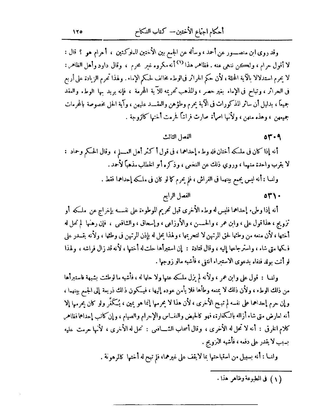 (٥٣٧٣) الْفَصْلُ الثَّالِثُ: أَنَّهُ إذَا كَانَ فِي مِلْكِهِ أُخْتَانِ، فَلَهُ وَطْءُ إحْدَاهُمَا، فِي قَوْلِ أَكْثَرِ أَهْلِ الْعِلْمِ. وَقَالَ الْحَكَمُ، وَحَمَّادٌ: لَا يَقْرَبُ وَاحِدَةً مِنْهُمَا. وَرُوِيَ ذَلِكَ عَنْ النَّخَعِيِّ. وَذَكَرَهُ أَبُو الْخَطَّابِ مَذْهَبًا لِأَحْمَدَ. وَلَنَا، أَنَّهُ لَيْسَ يَجْمَعُ بَيْنَهُمَا فِي الْفِرَاشِ، فَلَمْ يُحَرَّمْ، كَمَا لَوْ كَانَ فِي مِلْكِهِ إحْدَاهُمَا فَقَطْ.