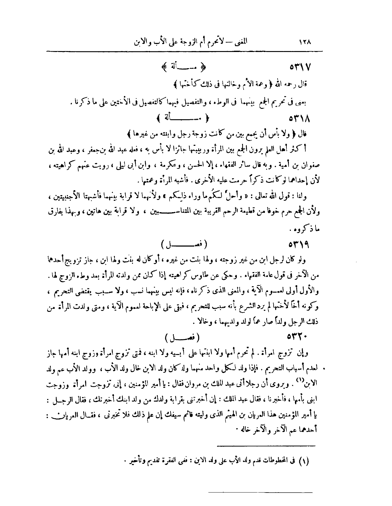 (٥٣٨٤) فَصْلٌ: وَإِنْ تَزَوَّجَ امْرَأَةً لَمْ تُحَرَّمْ أُمُّهَا وَلَا ابْنَتُهَا عَلَى أَبِيهِ وَلَا ابْنِهِ، فَمَتَى تَزَوَّجَ امْرَأَةً وَزَوَّجَ ابْنَهُ أُمَّهَا جَازَ؛ لِعَدَمِ أَسْبَابِ التَّحْرِيمِ. فَإِذَا وُلِدَ لِكُلِّ وَاحِدٍ مِنْهُمَا وَلَدٌ، كَانَ وَلَدُ الِابْنِ خَالَ وَلَدِ الْأَبِ، وَوَلَدُ الْأَبِ عَمَّ وَلَدِ الِابْنِ وَيُرْوَى أَنَّ رَجُلًا أَتَى عَبْدَ الْمَلِكِ بْنَ مَرْوَانَ، فَقَالَ: يَا أَمِيرَ الْمُؤْمِنِينَ، إنِّي تَزَوَّجْت امْرَأَةً، وَزَوَّجْت ابْنِي بِأُمِّهَا، فَأَخْبِرْنَا. فَقَالَ عَبْدُ الْمَلِكِ: إنْ أَخْبَرْتنِي بِقَرَابَةِ وَلَدِك مِنْ وَلَدِ ابْنِك أَخْبَرْتُك. فَقَالَ الرَّجُلُ: يَا أَمِيرَ الْمُؤْمِنِينَ، هَذَا الْعُرْيَانُ بْنُ الْهَيْثَمِ الَّذِي وَلَّيْتَهُ قَائِمَ سَيْفِكَ، إنْ عَلِمَ ذَلِكَ فَلَا تُخْبِرْنِي. فَقَالَ الْعُرْيَانُ: أَحَدُهُمَا عَمُّ الْآخَرِ، وَالْآخَرُ خَالُهُ.