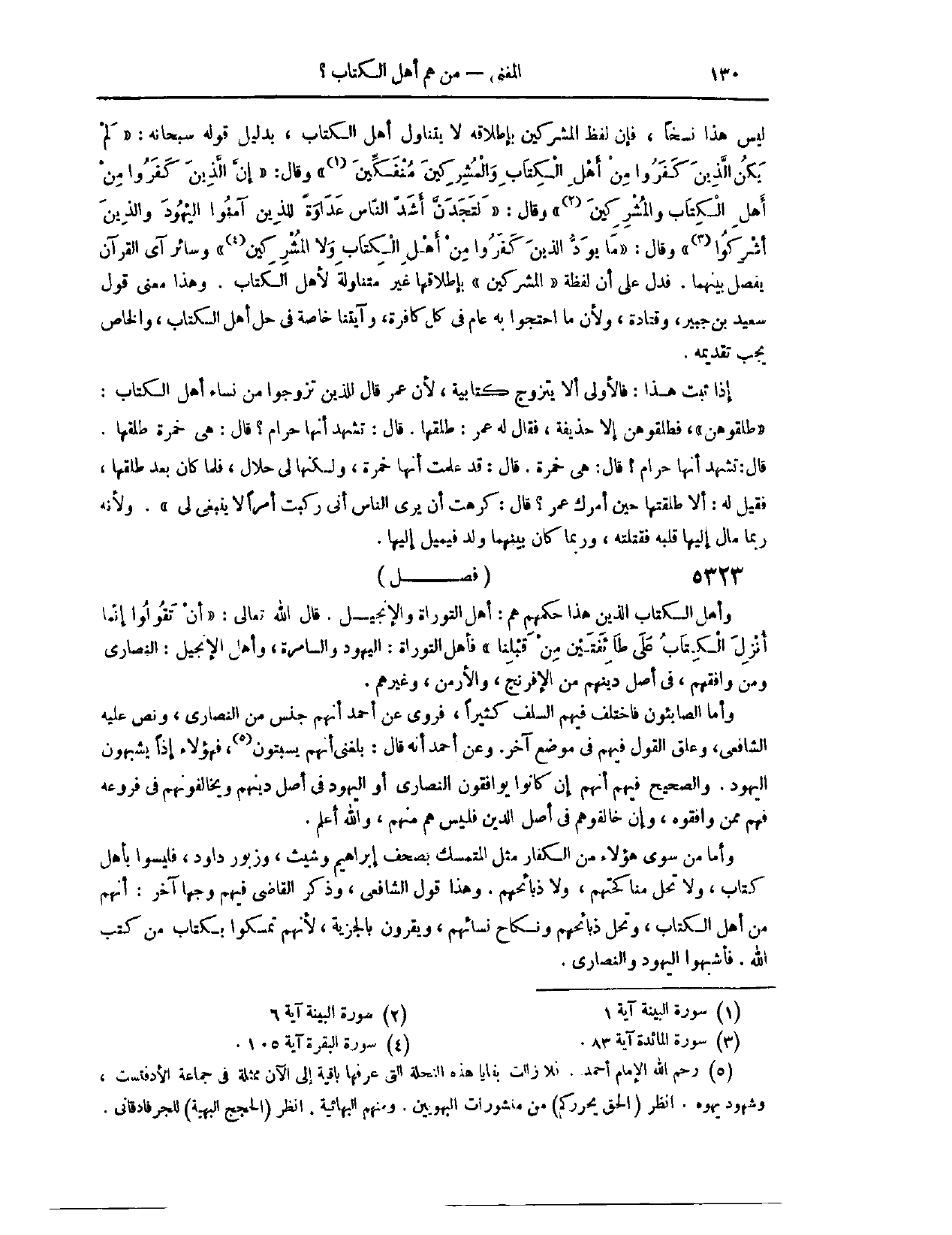 وَسَائِرُ آيِ الْقُرْآنِ يَفْصِلُ بَيْنَهُمَا، فَدَلَّ عَلَى أَنَّ لَفْظَةَ الْمُشْرِكِينَ بِإِطْلَاقِهَا غَيْرُ مُتَنَاوِلَةٍ لِأَهْلِ الْكِتَابِ، وَهَذَا مَعْنَى قَوْلِ سَعِيدِ بْنِ جُبَيْرٍ، وَقَتَادَةَ، وَلِأَنَّ مَا احْتَجُّوا بِهِ عَامٌّ فِي كُلِّ كَافِرَةٍ، وَآيَتُنَا خَاصَّةٌ فِي حِلِّ أَهْلِ الْكِتَابِ، وَالْخَاصُّ يَجِبُ تَقْدِيمُهُ. إذَا ثَبَتَ هَذَا، فَالْأَوْلَى أَنْ لَا يَتَزَوَّجَ كِتَابِيَّةً؛ لِأَنَّ عُمَرَ قَالَ لِلَّذِينَ تَزَوَّجُوا مِنْ نِسَاءِ أَهْلِ الْكِتَابِ: طَلِّقُوهُنَّ. فَطَلَّقُوهُنَّ إلَّا حُذَيْفَةَ، فَقَالَ لَهُ عُمَرُ: طَلِّقْهَا. قَالَ: تَشْهَدُ أَنَّهَا حَرَامٌ؟ قَالَ: هِيَ جَمْرَةٌ، طَلِّقْهَا. قَالَ: تَشْهَدُ أَنَّهَا حَرَامٌ؟ قَالَ: هِيَ جَمْرَةٌ. قَالَ: قَدْ عَلِمْت أَنَّهَا جَمْرَةٌ، وَلَكِنَّهَا لِي حَلَالٌ. فَلَمَّا كَانَ بَعْدُ طَلَّقَهَا، فَقِيلَ لَهُ: أَلَا طَلَّقْتهَا حِينَ أَمَرَك عُمَرُ؟ قَالَ: كَرِهْت أَنْ يَرَى النَّاسُ أَنِّي رَكِبْت أَمْرًا لَا يَنْبَغِي لِي. وَلِأَنَّهُ رُبَّمَا مَالَ إلَيْهَا قَلْبُهُ فَفَتَنَتْهُ، وَرُبَّمَا كَانَ بَيْنَهُمَا وَلَدٌ فَيَمِيلُ إلَيْهَا. (٥٣٨٧) فَصْلٌ: وَأَهْلُ الْكِتَابِ الَّذِينَ هَذَا حُكْمُهُمْ، هُمْ أَهْلُ التَّوْرَاةِ وَالْإِنْجِيلِ. قَالَ اللَّهُ تَعَالَى: {أَنْ تَقُولُوا إِنَّمَا أُنْزِلَ الْكِتَابُ عَلَى طَائِفَتَيْنِ مِنْ قَبْلِنَا} [الأنعام: ١٥٦] . فَأَهْلُ التَّوْرَاةِ الْيَهُودُ وَالسَّامِرَةُ، وَأَهْلُ الْإِنْجِيلِ النَّصَارَى، وَمَنْ وَافَقَهُمْ فِي أَصْلِ دِينِهِمْ مِنْ الْإِفْرِنْجِ وَالْأَرْمَنِ وَغَيْرِهِمْ.