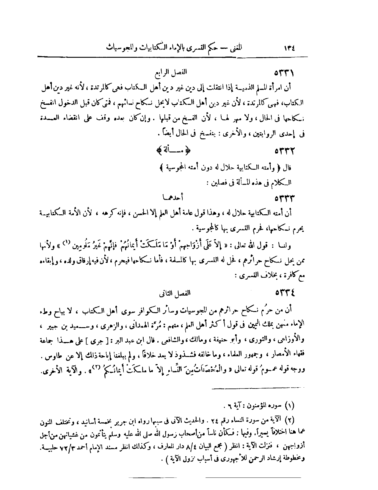 (٥٣٩٦) مَسْأَلَةٌ؛ قَالَ: (وَأَمَتُهُ الْكِتَابِيَّةُ حَلَالٌ لَهُ، دُونَ أَمَتِهِ الْمَجُوسِيَّةِ) الْكَلَامُ فِي هَذِهِ الْمَسْأَلَةِ فِي فَصْلَيْنِ: (٥٣٩٧) أَحَدُهُمَا: أَنَّ أَمَتَهُ الْكِتَابِيَّةَ حَلَالٌ لَهُ. وَهَذَا قَوْلُ عَامَّةِ أَهْلِ الْعِلْمِ، إلَّا الْحَسَنَ، فَإِنَّهُ كَرِهَهُ؛ لِأَنَّ الْأَمَةَ الْكِتَابِيَّةَ يُحَرَّمُ نِكَاحُهَا فَحُرِّمَ التَّسَرِّي بِهَا كَالْمَجُوسِيَّةِ. وَلَنَا، قَوْلُ اللَّهِ تَعَالَى {إِلا عَلَى أَزْوَاجِهِمْ أوْ مَا مَلَكَتْ أَيْمَانُهُمْ فَإِنَّهُمْ غَيْرُ مَلُومِينَ} [المؤمنون: ٦] . وَلِأَنَّهَا مِمَّنْ يَحِلُّ نِكَاحُ حَرَائِرِهِمْ، فَحَلَّ لَهُ التَّسَرِّي بِهَا، كَالْمُسْلِمَةِ.