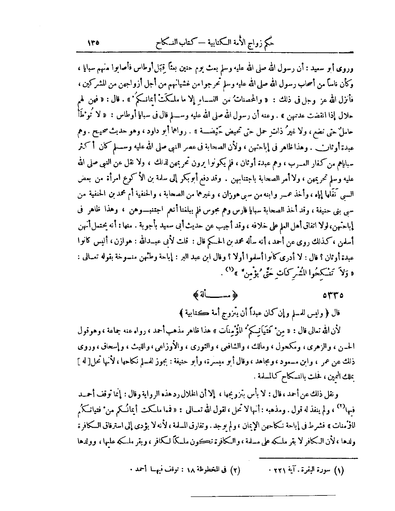 وَقَدْ أَجَبْت عَنْ حَدِيثِ أَبِي سَعِيدٍ بِأَجْوِبَةٍ، مِنْهَا أَنَّهُ يَحْتَمِلُ أَنَّهُنَّ أَسْلَمْنَ، كَذَلِكَ رُوِيَ عَنْ أَحْمَدَ أَنَّهُ سَأَلَهُ مُحَمَّدُ بْنُ الْحَكَمِ قَالَ: قُلْت لِأَبِي عَبْدِ اللَّهِ: هَوَازِنُ أَلَيْسَ كَانُوا عَبَدَةَ أَوْثَانٍ؟ قَالَ: لَا أَدْرِي كَانُوا أَسْلَمُوا أَوْ لَا. وَقَالَ ابْنُ عَبْدِ الْبَرِّ: إبَاحَةُ وَطْئِهِنَّ مَنْسُوخَةٌ بِقَوْلِهِ تَعَالَى {وَلا تَنْكِحُوا الْمُشْرِكَاتِ حَتَّى يُؤْمِنَّ} [البقرة: ٢٢١] . (٥٣٩٩)
