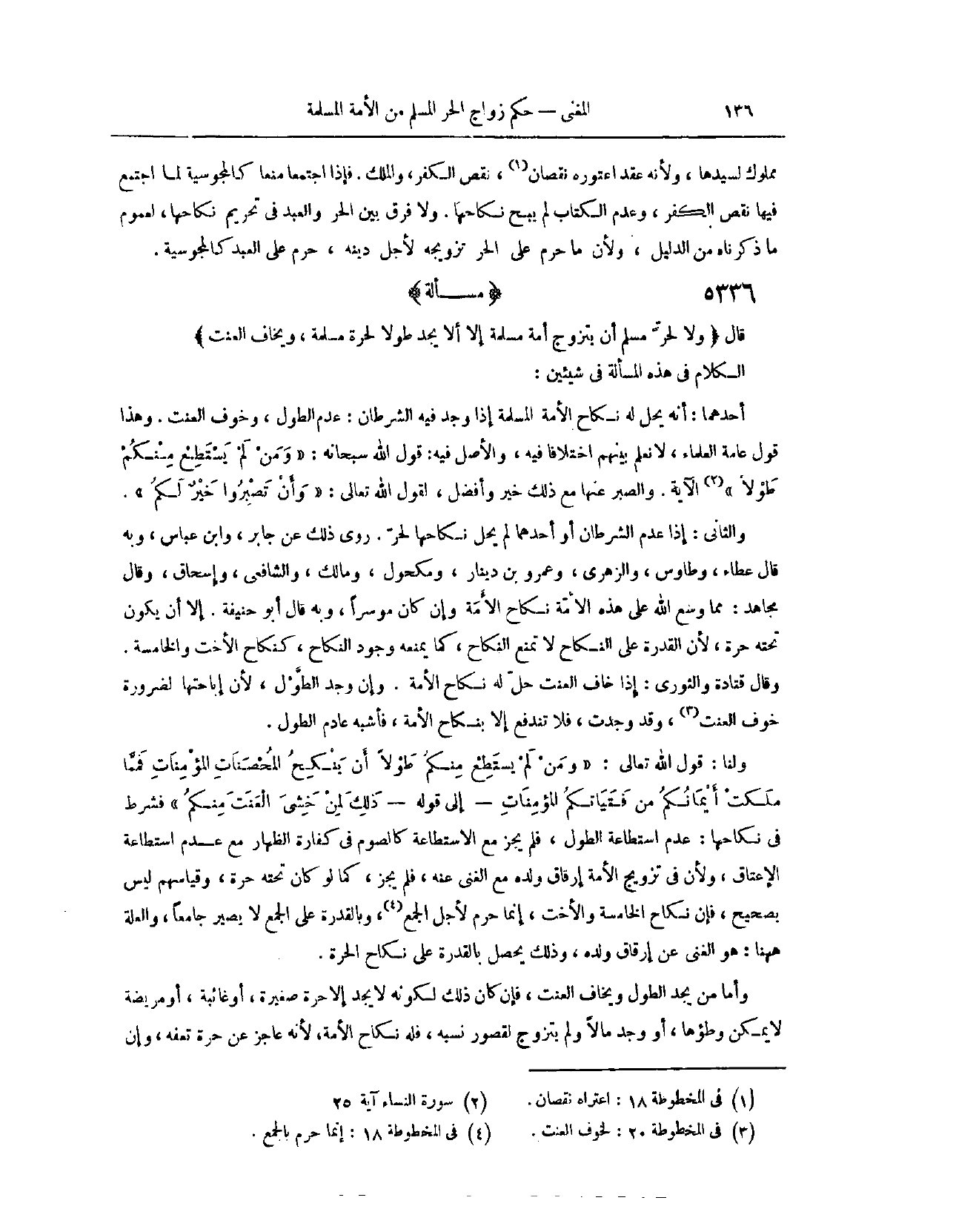 (٥٤٠٠) مَسْأَلَةٌ؛ قَالَ: (وَلَا لِحُرٍّ مُسْلِمٍ أَنْ يَتَزَوَّجَ أَمَةً مُسْلِمَةً، إلَّا أَنْ لَا يَجِدَ طَوْلًا بِحُرَّةٍ مُسْلِمَةٍ، وَيَخَافَ الْعَنَتَ) الْكَلَامُ فِي هَذِهِ الْمَسْأَلَةِ فِي شَيْئَيْنِ؛ أَحَدُهُمَا، أَنَّهُ يَحِلُّ لَهُ نِكَاحُ الْأَمَةِ الْمُسْلِمَةِ إذَا وُجِدَ فِيهِ الشَّرْطَانِ، عَدَمُ الطَّوْلِ، وَخَوْفُ الْعَنَتِ. وَهَذَا قَوْلُ عَامَّةِ الْعُلَمَاءِ، لَا نَعْلَمُ بَيْنَهُمْ اخْتِلَافًا فِيهِ. وَالْأَصْلُ فِيهِ قَوْلُ اللَّهِ سُبْحَانَهُ {وَمَنْ لَمْ يَسْتَطِعْ مِنْكُمْ طَوْلا} [النساء: ٢٥] .
