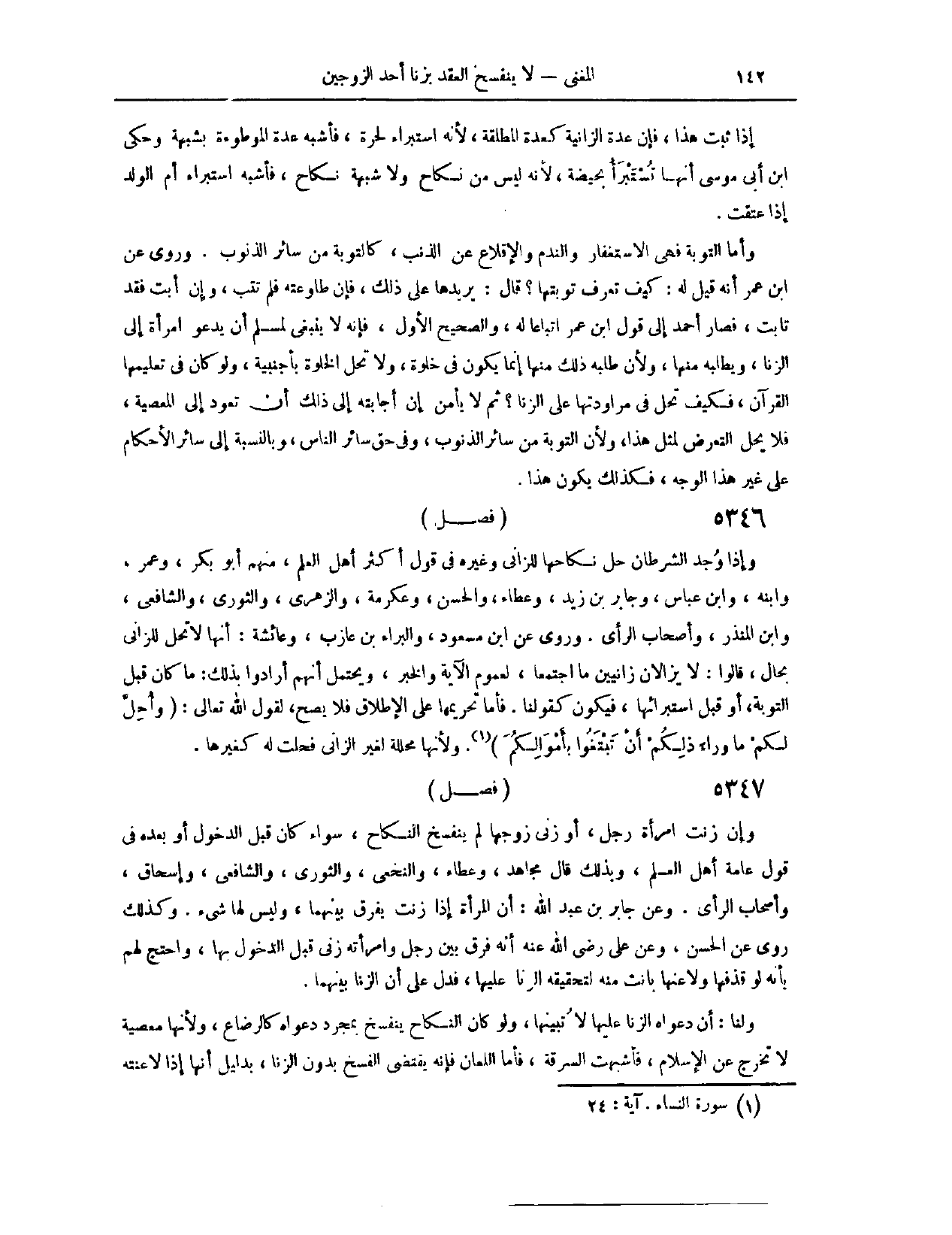 (٥٤١١) فَصْلٌ: وَإِنْ زَنَتْ امْرَأَةُ رَجُلٍ، أَوْ زَنَى زَوْجُهَا، لَمْ يَنْفَسِخْ النِّكَاحُ، سَوَاءٌ كَانَ قَبْلَ الدُّخُولِ أَوْ بَعْدَهُ، فِي قَوْلِ عَامَّةِ أَهْلِ الْعِلْمِ. وَبِذَلِكَ قَالَ مُجَاهِدٌ، وَعَطَاءٌ، وَالنَّخَعِيُّ، وَالثَّوْرِيُّ، وَالشَّافِعِيُّ، وَإِسْحَاقُ، وَأَصْحَابُ الرَّأْيِ. وَعَنْ جَابِرِ بْنِ عَبْدِ اللَّهِ، أَنَّ الْمَرْأَةَ إذَا زَنَتْ يُفَرَّقُ بَيْنَهُمَا، وَلَيْسَ لَهَا شَيْءٌ. وَكَذَلِكَ رُوِيَ عَنْ الْحَسَنِ. وَعَنْ عَلِيٍّ - رَضِيَ اللَّهُ عَنْهُ - أَنَّهُ فَرَّقَ بَيْنَ رَجُلٍ وَامْرَأَتِهِ زَنَى قَبْلَ الدُّخُولِ بِهَا.