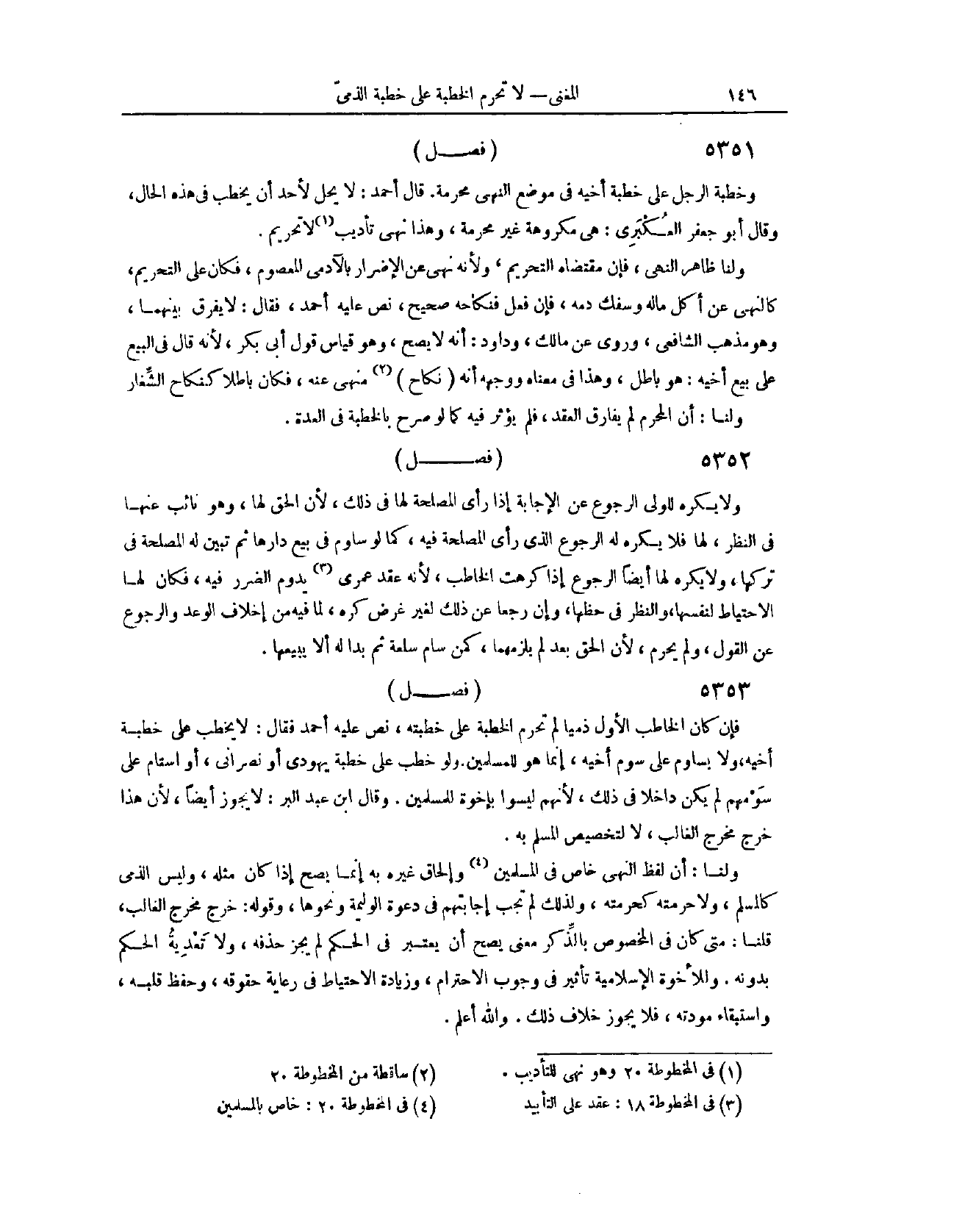 (٥٤١٥) فَصْلٌ: وَخِطْبَةُ الرَّجُلِ عَلَى خِطْبَةِ أَخِيهِ فِي مَوْضِعِ النَّهْيِ مُحَرَّمَةٌ. قَالَ أَحْمَدُ: لَا يَحِلُّ لَأَحَدٍ أَنْ يَخْطُبَ فِي هَذِهِ الْحَالِ. وَقَالَ أَبُو حَفْصٍ الْعُكْبَرِيُّ: هِيَ مَكْرُوهَةٌ غَيْرُ مُحَرَّمَةٍ، وَهَذَا نَهْيُ تَأْدِيبٍ لَا تَحْرِيمٍ.