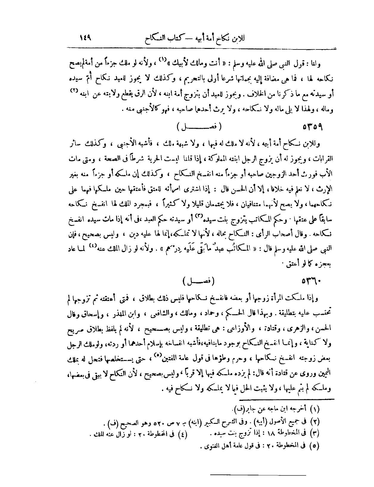 (٥٤٢٣) فَصْلٌ: وَلِلِابْنِ نِكَاحُ أَمَةِ أَبِيهِ؛ لِأَنَّهُ لَا مِلْكَ لَهُ فِيهَا، وَلَا شُبْهَةَ مِلْكٍ، فَأَشْبَهَ الْأَجْنَبِيَّ، وَكَذَلِكَ سَائِرُ الْقَرَابَاتِ. وَيَجُوزُ أَنْ يُزَوِّجَ الرَّجُلُ ابْنَتَهُ لِمَمْلُوكِهِ، إذَا قُلْنَا: لَيْسَتْ الْحُرِّيَّةُ شَرْطًا فِي الصِّحَّةِ. وَمَتَى مَاتَ الْأَبُ، فَوَرِثَ أَحَدُ الزَّوْجَيْنِ صَاحِبَهُ، أَوْ جُزْءًا مِنْهُ، انْفَسَخَ النِّكَاح. وَكَذَلِكَ إنْ مَلَكَهُ أَوْ جُزْءًا مِنْهُ بِغَيْرِ الْإِرْثِ. لَا نَعْلَمُ فِيهِ خِلَافًا، إلَّا أَنَّ الْحَسَنَ قَالَ: إذَا اشْتَرَى امْرَأَتَهُ لِلْعِتْقِ، فَأَعْتَقَهَا حِينَ مَلَكَهَا، فَهُمَا عَلَى نِكَاحِهِمَا. وَلَا يَصِحُّ؛ لِأَنَّهُمَا مُتَنَافِيَانِ، فَلَا يَجْتَمِعَانِ قَلِيلًا وَلَا كَثِيرًا، فَبِمُجَرَّدِ الْمِلْكِ لَهَا انْفَسَخَ نِكَاحُهُ سَابِقًا عَلَى عِتْقِهَا.