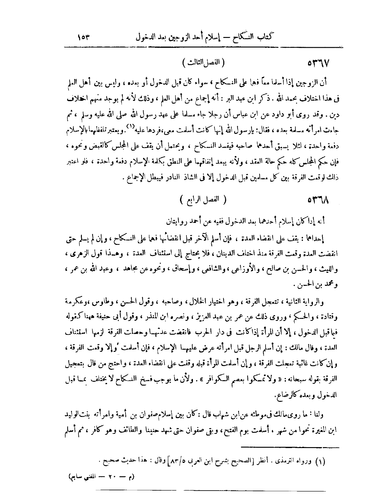 (٥٤٣٢) الْفَصْلُ الرَّابِعُ: أَنَّهُ إذَا كَانَ إسْلَامُ أَحَدِهِمَا بَعْدَ الدُّخُولِ، فَفِيهِ عَنْ أَحْمَدَ رِوَايَتَانِ؛ إحْدَاهُمَا، يَقِفُ عَلَى انْقِضَاءِ الْعِدَّةِ، فَإِنْ أَسْلَمَ الْآخَرُ قَبْلَ انْقِضَائِهَا، فَهُمَا عَلَى النِّكَاحِ، وَإِنْ لَمْ يُسْلِمْ حَتَّى انْقَضَتْ الْعِدَّةُ، وَقَعَتْ الْفُرْقَةُ مُنْذُ اخْتَلَفَ الدِّينَانِ، فَلَا يَحْتَاجُ إلَى اسْتِئْنَافِ الْعِدَّةِ