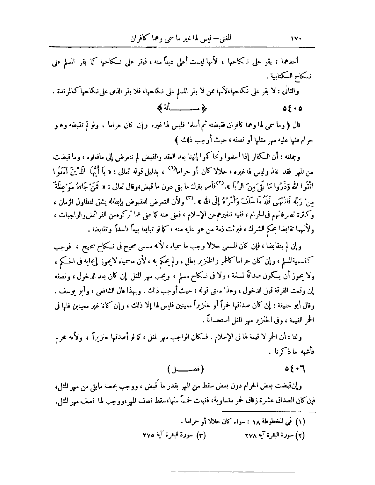 وَقَالَ تَعَالَى: {فَمَنْ جَاءَهُ مَوْعِظَةٌ مِنْ رَبِّهِ فَانْتَهَى فَلَهُ مَا سَلَفَ وَأَمْرُهُ إِلَى اللَّهِ} [البقرة: ٢٧٥] . وَلِأَنَّ التَّعَرُّضَ لِلْمَقْبُوضِ بِأَبْطَالِهِ يَشُقُّ، لِتَطَاوُلِ الزَّمَانِ، وَكَثْرَةِ تَصَرُّفَاتِهِمْ فِي الْحَرَامِ، فَفِيهِ تَنْفِيرُهُمْ عَنْ الْإِسْلَامِ، فَعُفِيَ عَنْهُ، كَمَا عُفِيَ عَمَّا تَرَكُوهُ مِنْ الْفَرَائِضِ وَالْوَاجِبَاتِ، وَلِأَنَّهُمَا تَقَابَضَا بِحُكْمِ الشِّرْكِ، فَبَرِئَتْ ذِمَّةُ مَنْ هُوَ عَلَيْهِ مِنْهُ، كَمَا لَوْ تَبَايَعَا بَيْعًا فَاسِدًا وَتَقَابَضَا. وَإِنْ لَمْ يَتَقَابَضَا، فَإِنْ كَانَ الْمُسَمَّى حَلَالًا، وَجَبَ مَا سَمَّيَاهُ؛ لِأَنَّهُ مُسَمًّى صَحِيحٌ فِي نِكَاحٍ صَحِيحٍ، فَوَجَبَ، كَتَسْمِيَةِ الْمُسْلِمِ وَإِنْ كَانَ حَرَامًا، كَالْخَمْرِ وَالْخِنْزِيرِ، بَطَلَ، وَلَمْ يُحْكَمْ بِهِ؛ لِأَنَّ مَا سَمَّيَاهُ لَا يَجُوزُ إيجَابُهُ فِي الْحُكْمِ، وَلَا يَجُوزُ أَنْ يَكُونَ صَدَاقًا لَمُسْلِمَةٍ، وَلَا فِي نِكَاحِ مُسْلِمٍ، وَيَجِبُ مَهْرُ الْمِثْلِ إنْ كَانَ بَعْدَ الدُّخُولِ، وَنِصْفُهُ إنْ وَقَعْت الْفُرْقَةُ قَبْلَ الدُّخُولِ. وَهَذَا مَعْنَى قَوْلِهِ: حَيْثُ أَوْجَبَ ذَلِكَ