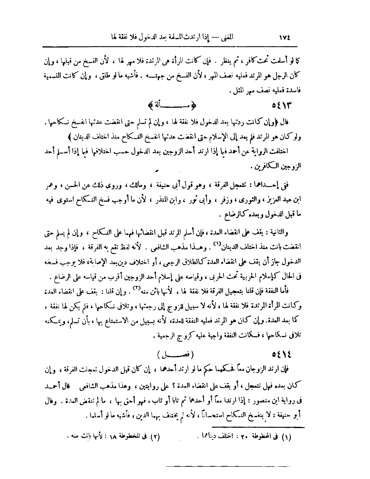 (٥٤٧٩) مَسْأَلَةٌ؛ قَالَ: (وَإِنْ كَانَتْ رِدَّتُهَا بَعْدَ الدُّخُولِ، فَلَا نَفَقَةَ لَهَا. وَإِنْ لَمْ تُسْلِمْ حَتَّى انْقَضَتْ عِدَّتُهَا، انْفَسَخَ نِكَاحُهَا، وَلَوْ كَانَ هُوَ الْمُرْتَدُّ بَعْدَ الدُّخُولِ، فَلَمْ يَعُدْ إلَى الْإِسْلَامِ حَتَّى انْقَضَتْ عِدَّتُهَا، انْفَسَخَ النِّكَاحُ مُنْذُ اخْتَلَفَ الدِّينَانِ) اخْتَلَفَتْ الرِّوَايَةُ عَنْ أَحْمَدَ، فِيمَا إذَا ارْتَدَّ أَحَدُ الزَّوْجَيْنِ بَعْدَ الدُّخُولِ، حَسْبَ اخْتِلَافِهَا فِيمَا إذَا أَسْلَمَ أَحَدُ الزَّوْجَيْنِ الْكَافِرَيْنِ، فَفِي إحْدَاهُمَا تَتَعَجَّلُ الْفُرْقَةُ