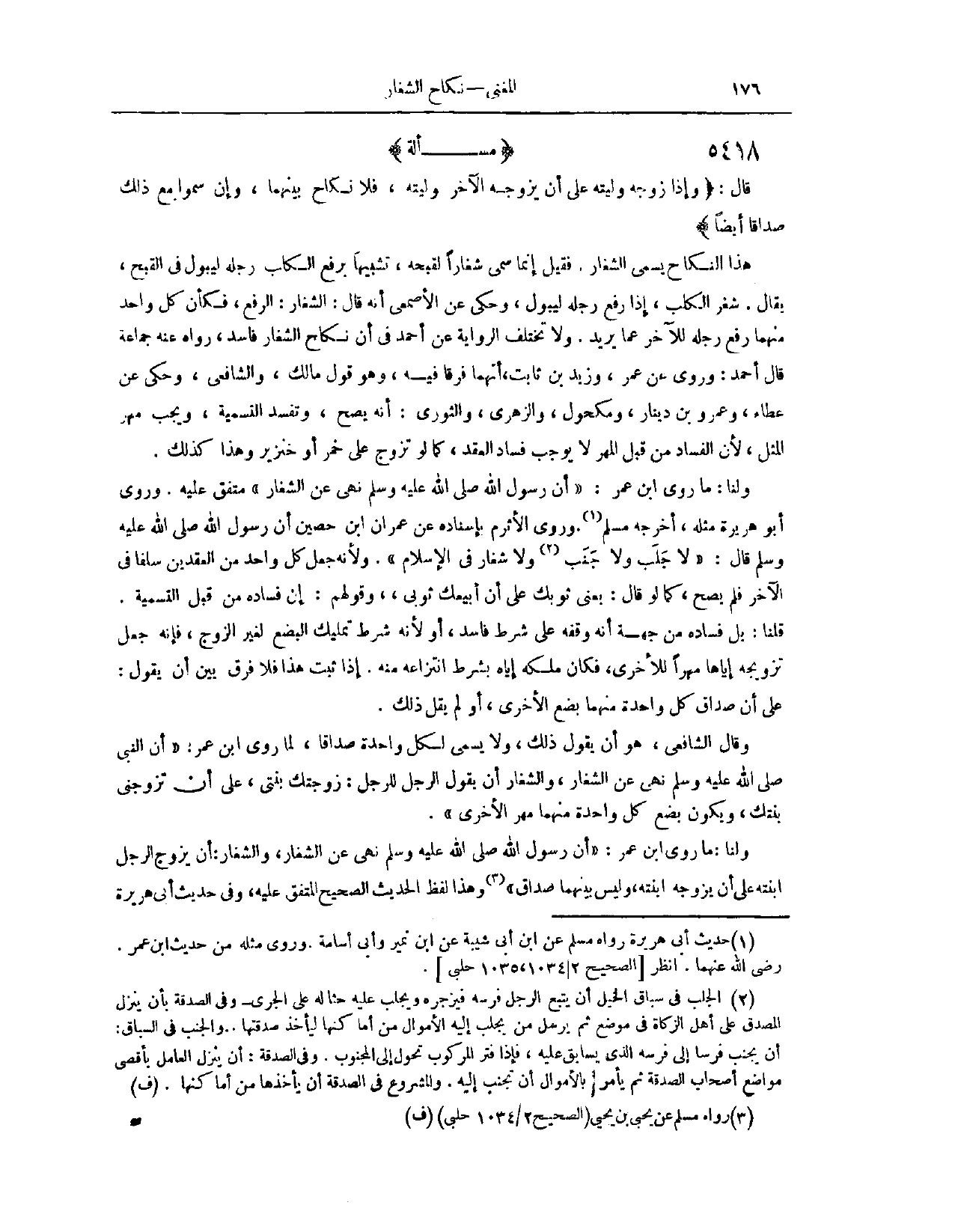 (٥٤٨٤) مَسْأَلَةٌ؛ قَالَ: (وَإِذَا زَوَّجَهُ وَلِيَّتَهُ، عَلَى أَنْ يُزَوِّجَهُ الْآخَرُ وَلِيَّتَهُ، فَلَا نِكَاحَ بَيْنَهُمَا، وَإِنْ سَمَّوْا مَعَ ذَلِكَ صَدَاقًا أَيْضًا) . هَذَا النِّكَاحُ يُسَمَّى الشِّغَارَ. فَقِيلَ: إنَّمَا سُمِّيَ شِغَارًا لِقُبْحِهِ، تَشْبِيهًا بِرَفْعِ الْكَلْبِ رِجْلَهُ لِيَبُولَ، فِي الْقُبْحِ. يُقَالُ: شَغَرَ الْكَلْبُ: إذَا رَفَعَ رِجْلَهُ لِيَبُولَ، وَحُكِيَ عَنْ الْأَصْمَعِيِّ أَنَّهُ قَالَ: الشِّغَارُ: الرَّفْعُ. فَكَأَنَّ كُلَّ وَاحِدٍ مِنْهُمَا رَفَعَ رِجْلَهُ لِلْآخِرِ عَمَّا يُرِيدُ. وَلَا تَخْتَلِفُ الرِّوَايَةُ عَنْ أَحْمَدَ، فِي أَنَّ نِكَاحَ الشِّغَارِ فَاسِدٌ. رَوَاهُ عَنْهُ جَمَاعَةٌ. قَالَ أَحْمَدُ: وَرُوِيَ عَنْ عُمَرَ، وَزِيدَ بْنِ ثَابِتٍ، أَنَّهُمَا فَرَّقَا فِيهِ. وَهُوَ قَوْلُ مَالِكٍ، وَالشَّافِعِيِّ وَإِسْحَاقَ حُكِيَ عَنْ عَطَاءٍ، وَعَمْرِو بْنِ دِينَارٍ، وَمَكْحُولٍ، وَالزُّهْرِيِّ، وَالثَّوْرِيِّ، أَنَّهُ يَصِحُّ، وَتَفْسُدُ التَّسْمِيَةُ، وَيَجِبُ مَهْرُ الْمِثْلِ؛ لِأَنَّ الْفَسَادَ مِنْ قِبَلِ الْمَهْرِ لَا يُوجِبُ فَسَادَ الْعَقْدِ، كَمَا لَوْ تَزَوَّجَ عَلَى خَمْرٍ أَوْ خِنْزِيرٍ، وَهَذَا كَذَلِكَ