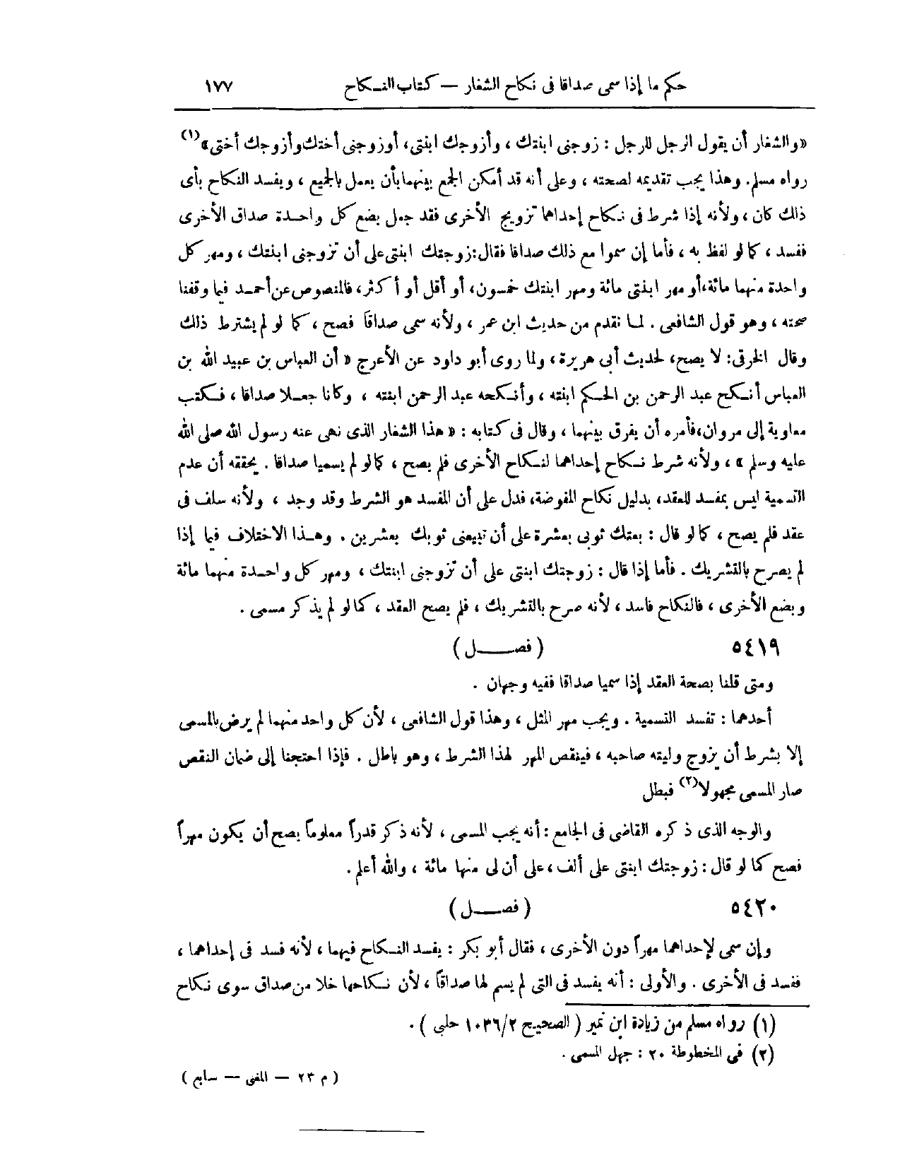 وَلِأَنَّهُ إذَا شَرَطَ فِي نِكَاحِ إحْدَاهُمَا تَزْوِيجَ الْأُخْرَى، فَقَدْ جَعَلَ بُضْعَ كُلِّ وَاحِدَةٍ صَدَاقَ الْأُخْرَى، فَفَسَدَ، كَمَا لَوْ لَفَظَ بِهِ، فَأَمَّا إنْ سَمَّوْا مَعَ ذَلِكَ صَدَاقًا، فَقَالَ: زَوَّجْتُك ابْنَتِي، عَلَى أَنْ تُزَوِّجُنِي ابْنَتَك، وَمَهْرُ كُلِّ وَاحِدَةٍ مِنْهُمَا مِائَةٌ، أَوْ مَهْرُ ابْنَتِي مِائَةٌ وَمَهْرُ ابْنَتِك خَمْسُونَ، أَوْ أَقَلُّ أَوْ أَكْثَرُ، فَالْمَنْصُوصُ عَنْ أَحْمَدَ، فِيمَا وَقَفْنَا عَلَيْهِ، صِحَّتُهُ. وَهُوَ قَوْلُ الشَّافِعِيِّ لِمَا تَقَدَّمَ مِنْ حَدِيثِ ابْنِ عُمَرَ، وَلِأَنَّهُ قَدْ سَمَّى صَدَاقًا، فَصَحَّ، كَمَا لَوْ لَمْ يَشْتَرِطْ ذَلِكَ. وَقَالَ الْخِرَقِيِّ: لَا يَصِحُّ؛ لِحَدِيثِ أَبِي هُرَيْرَةَ، وَلِمَا رَوَى أَبُو دَاوُد، عَنْ الْأَعْرَجِ، أَنَّ الْعَبَّاسَ بْنَ عُبَيْدِ اللَّهِ بْنِ الْعَبَّاسِ، أَنْكَحَ عَبْدَ الرَّحْمَنَ بْنَ الْحَكَمِ ابْنَتَهُ، وَأَنْكَحَهُ عَبْدُ الرَّحْمَنِ ابْنَتَهُ، وَكَانَا جَعَلَا صَدَاقًا، فَكَتَبَ مُعَاوِيَةُ إلَى مَرْوَانَ، فَأَمَرَهُ أَنْ يُفَرَّقَ بَيْنَهُمَا، وَقَالَ فِي كِتَابِهِ: هَذَا الشِّغَارُ الَّذِي نَهَى عَنْهُ رَسُولُ اللَّهِ - صَلَّى اللَّهُ عَلَيْهِ وَسَلَّمَ -. وَلِأَنَّهُ شَرَطَ نِكَاحَ إحْدَاهُمَا لِنِكَاحِ الْأُخْرَى، فَلَمْ يَصِحَّ، كَمَا لَوْ لَمْ يُسَمِّيَا صَدَاقًا