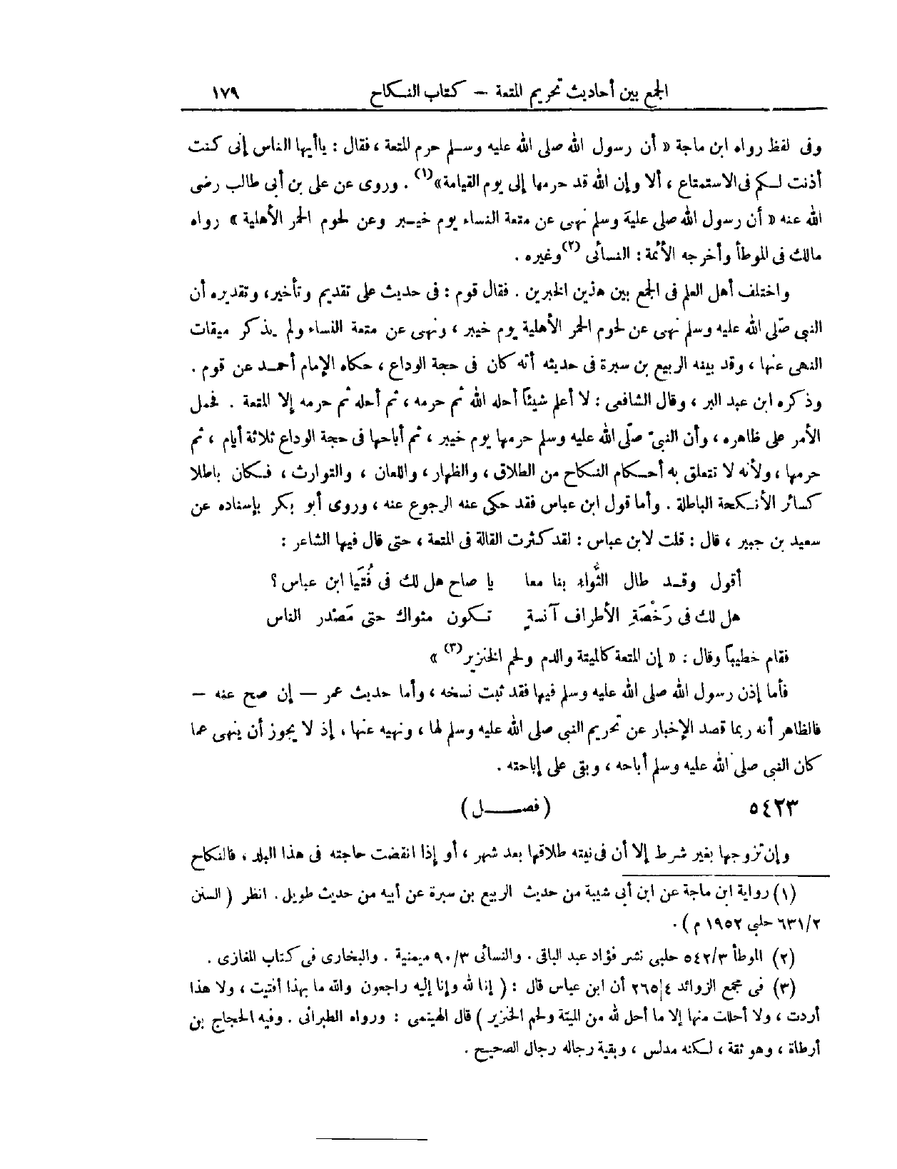 وَاخْتَلَفَ أَهْلُ الْعِلْمِ فِي الْجَمْعِ بَيْنَ هَذَيْنِ الْخَبَرَيْنِ، فَقَالَ قَوْمُ: فِي حَدِيثِ عَلِيٍّ تَقْدِيمٌ وَتَأْخِيرٌ، وَتَقْدِيرُهُ أَنَّ النَّبِيَّ - صَلَّى اللَّهُ عَلَيْهِ وَسَلَّمَ - نَهَى عَنْ لُحُومِ الْحُمُرِ الْأَهْلِيَّةِ يَوْمَ خَيْبَرَ، وَنَهَى عَنْ مُتْعَةِ النِّسَاءِ، وَلَمْ يَذْكُرْ مِيقَاتَ النَّهْيِ عَنْهَا، وَقَدْ بَيَّنَهُ الرَّبِيعُ بْنُ سَبْرَةَ فِي حَدِيثِهِ، أَنَّهُ كَانَ فِي حَجَّةِ الْوَدَاعِ. حَكَاهُ الْإِمَامُ أَحْمَدُ عَنْ قَوْمٍ، وَذَكَرَهُ ابْنُ عَبْدِ الْبَرِّ وَقَالَ الشَّافِعِيُّ: لَا أَعْلَمُ شَيْئًا أَحَلَّهُ اللَّهِ ثُمَّ حَرَّمَهُ، ثُمَّ أَحَلَّهُ ثُمَّ حَرَّمَهُ، إلَّا الْمُتْعَةَ. فَحَمَلَ الْأَمْرَ عَلَى ظَاهِرِهِ، وَأَنَّ النَّبِيَّ - صَلَّى اللَّهُ عَلَيْهِ وَسَلَّمَ - حَرَّمَهَا يَوْمَ خَيْبَرَ، ثُمَّ أَحَلَّهَا فِي حَجَّةِ الْوَدَاعِ ثَلَاثَةَ أَيَّامٍ، ثُمَّ حَرَّمَهَا، وَلِأَنَّهُ لَا تَتَعَلَّقُ بِهِ أَحْكَامُ النِّكَاحِ، مِنْ الطَّلَاقِ، وَالظِّهَارِ، وَاللِّعَانِ، وَالتَّوَارُثِ، فَكَانَ بَاطِلًا، كَسَائِرِ الْأَنْكِحَةِ الْبَاطِلَةِ. وَأَمَّا قَوْلُ ابْنِ عَبَّاسٍ، فَقَدْ حُكِيَ عَنْهُ الرُّجُوعُ عَنْهُ، فَرَوَى أَبُو بَكْرٍ، بِإِسْنَادِهِ عَنْ سَعِيدِ بْنِ جُبَيْرٍ، قَالَ: قُلْت لِابْنِ عَبَّاسٍ: لَقَدْ كَثُرَتْ الْقَالَةُ فِي الْمُتْعَةِ، حَتَّى قَالَ فِيهَا الشَّاعِرُ: