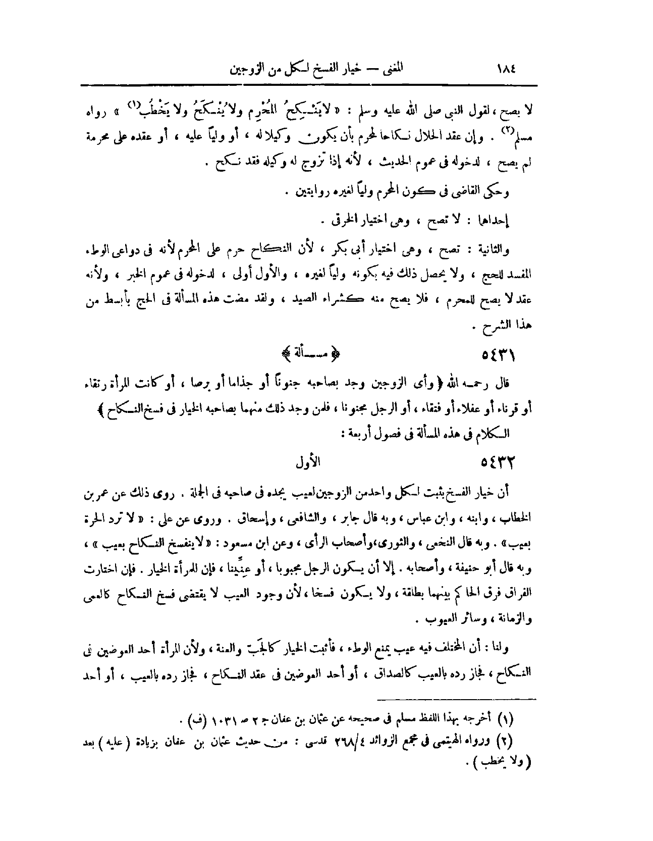 الْكَلَامُ فِي هَذِهِ الْمَسْأَلَةُ فِي فُصُولٍ أَرْبَعَةٍ: (٥٤٩٨) الْفَصْلُ الْأَوَّلُ: أَنَّ خِيَارَ الْفَسْخِ يَثْبُتُ لِكُلِّ وَاحِدٍ مِنْ الزَّوْجَيْنِ لِعَيْبِ يَجِدُهُ فِي صَاحِبِهِ فِي الْجُمْلَةِ. رُوِيَ ذَلِكَ عَنْ عُمَرَ بْنِ الْخَطَّابِ، وَابْنِهِ، وَابْنِ عَبَّاسٍ. وَبِهِ قَالَ جَابِرُ بْنُ زَيْدٍ، وَالشَّافِعِيُّ، وَإِسْحَاقُ. وَرُوِيَ عَنْ عَلِيٍّ: لَا تُرَدُّ الْحُرَّةُ بِعَيْبِ. وَبِهِ قَالَ النَّخَعِيُّ، وَالثَّوْرِيُّ، وَأَصْحَابُ الرَّأْيِ. وَعَنْ ابْنِ مَسْعُودٍ: لَا يَنْفَسِخُ النِّكَاحُ بِعَيْبِ. وَبِهِ قَالَ أَبُو حَنِيفَةَ وَأَصْحَابُهُ، إلَّا أَنْ يَكُونَ الرَّجُلُ مَجْبُوبًا أَوْ عِنِّينًا، فَإِنَّ لِلْمَرْأَةِ الْخِيَارَ، فَإِنْ اخْتَارَتْ الْفِرَاقَ، فَرَّقَ الْحَاكِمُ بَيْنَهُمَا بِطَلْقَةِ، وَلَا يَكُونُ فَسْخًا؛ لِأَنَّ وُجُودَ الْعَيْبِ لَا يَقْتَضِي فَسْخَ النِّكَاحِ، كَالْعَمَى وَالزَّمَانَةِ وَسَائِرِ الْعُيُوبِ