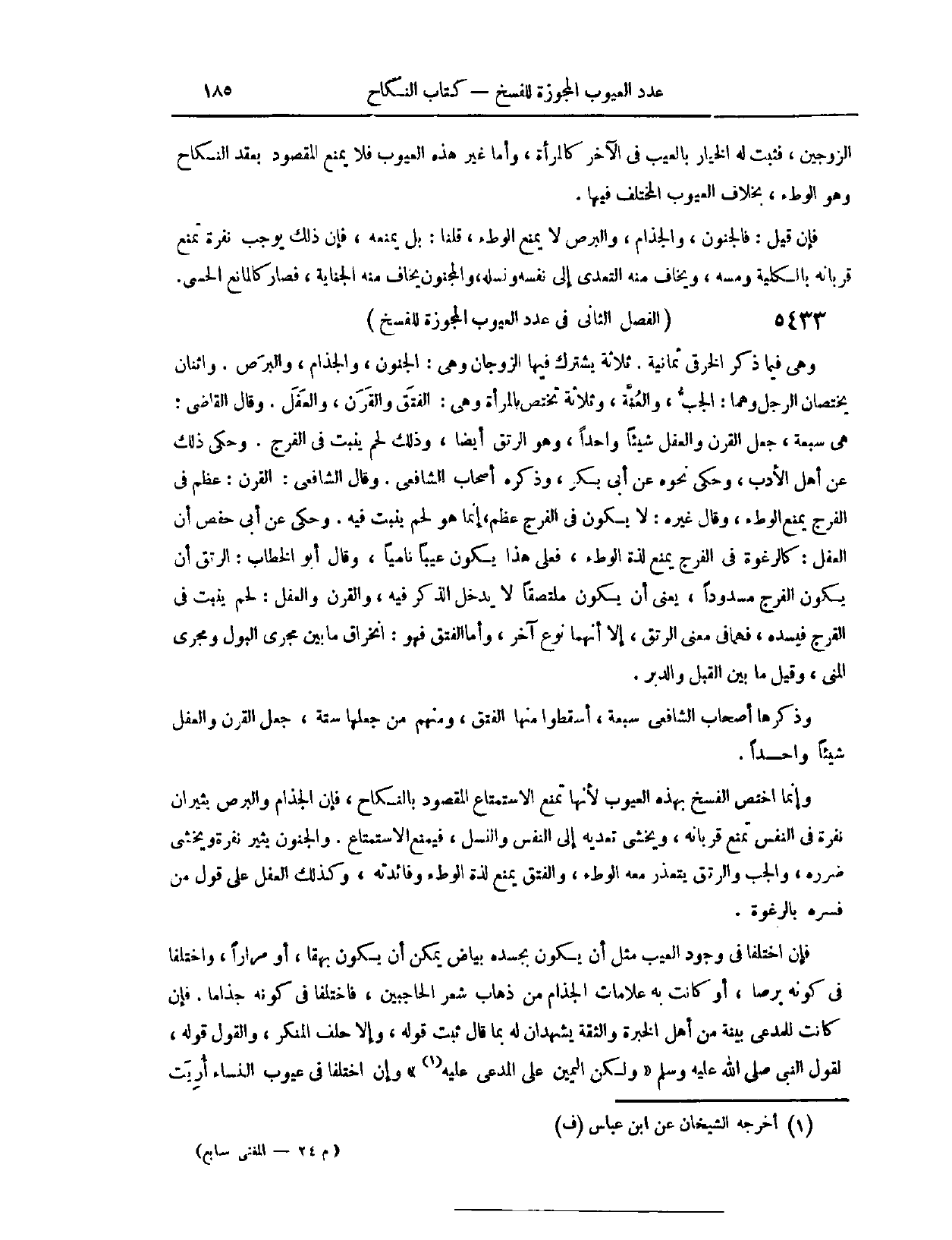 الْفَصْلُ الثَّانِي: فِي عَدَدِ الْعُيُوبِ الْمُجَوِّزَةِ لِلْفَسْخِ، وَهِيَ فِيمَا ذَكَرَ الْخِرَقِيِّ ثَمَانِيَةٌ: ثَلَاثَةٌ يَشْتَرِكُ فِيهَا الزَّوْجَانِ؛ وَهِيَ: الْجُنُونُ، وَالْجُذَامُ، وَالْبَرَصُ. وَاثْنَانِ يَخْتَصَّانِ الرَّجُلَ؛ وَهُمَا الْجَبُّ، وَالْعُنَّةُ. وَثَلَاثَةٍ تَخْتَصُّ بِالْمَرْأَةِ؛ وَهِيَ الْفَتْقُ، وَالْقَرْنُ، وَالْعَفَلُ