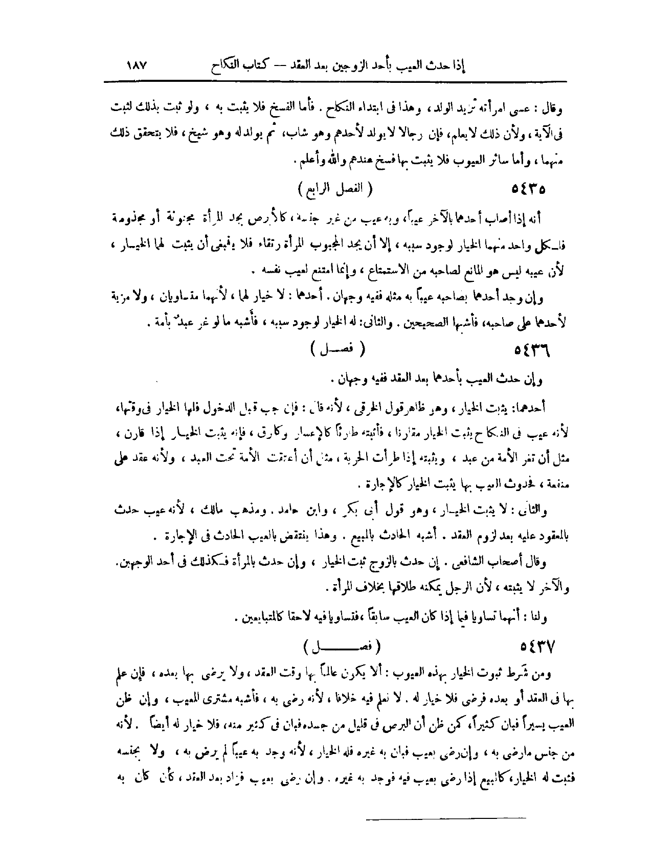 (٥٥٠٢) فَصْلٌ: وَإِنْ حَدَثَ الْعَيْبُ بِأَحَدِهِمَا بَعْدَ الْعَقْدِ، فَفِيهِ وَجْهَانِ؛ أَحَدُهُمَا، يَثْبُتُ الْخِيَارُ. وَهُوَ ظَاهِرُ قَوْلِ الْخِرَقِيِّ لِأَنَّهُ قَالَ: فَإِنْ جُبَّ قَبْلَ الدُّخُولِ، فَلَهَا الْخِيَارُ فِي وَقْتِهَا؛ لِأَنَّهُ عَيْبٌ فِي النِّكَاحَ يُثْبِتُ الْخِيَارَ مُقَارِنًا، فَأَثْبَتَهُ طَارِئًا، كَالْإِعْسَارِ وَكَالرِّقِّ، فَإِنَّهُ يُثْبِتُ الْخِيَارَ إذَا قَارَنَ، مِثْلُ أَنْ تَغِرَّ الْأَمَةُ مِنْ عَبْدٍ، وَيُثْبِتُهُ إذَا طَرَأَتْ الْحُرِّيَّةُ، مِثْلُ إنْ عَتَقَتْ الْأَمَةُ تَحْتَ الْعَبْدِ، وَلِأَنَّهُ عَقْدٌ عَلَى مَنْفَعَةٍ، فَحُدُوثُ الْعَيْبِ بِهَا يُثْبِتُ الْخِيَارَ، كَالْإِجَارَةِ. وَالثَّانِي، لَا يُثْبِتُ الْخِيَارَ. وَهُوَ قَوْلُ أَبِي بَكْرٍ وَابْنِ حَامِدٍ وَمَذْهَبُ مَالِكٍ لِأَنَّهُ عَيْبٌ حَدَثَ بِالْمَعْقُودِ عَلَيْهِ بَعْدَ لُزُومِ الْعَقْدِ، أَشْبَهَ الْحَادِثَ بِالْمَبِيعِ. وَهَذَا يَنْتَقِضُ بِالْعَيْبِ الْحَادِثِ فِي الْإِجَارَةِ