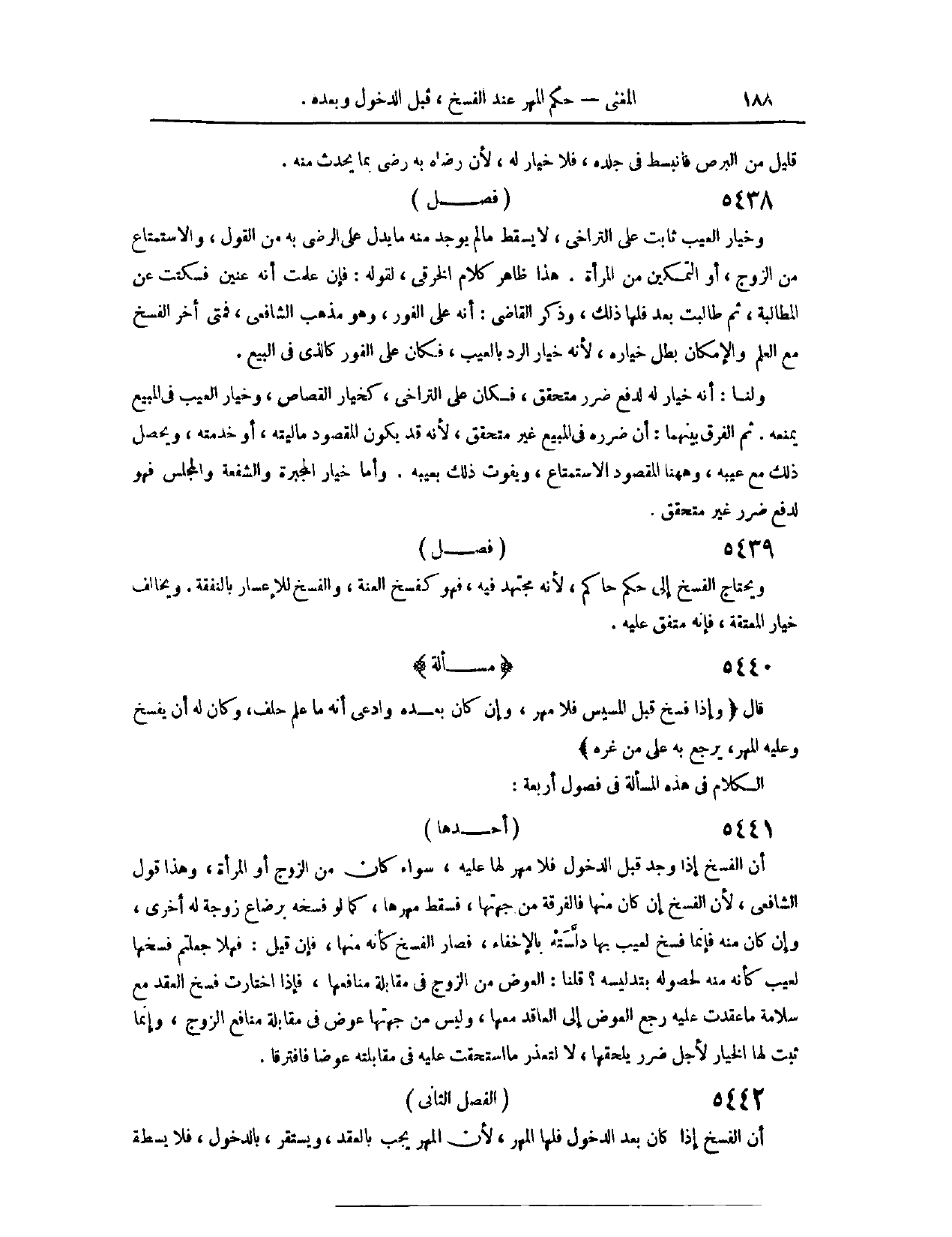 (٥٥٠٤) فَصْلٌ: وَخِيَارُ الْعَيْبِ ثَابِتٌ عَلَى التَّرَاخِي، لَا يَسْقُطُ، مَا لَمْ يُوجَدْ مِنْهُ مَا يَدُلُّ عَلَى الرِّضَى بِهِ، مِنْ الْقَوْلِ، أَوْ الِاسْتِمْتَاعِ مِنْ الزَّوْجِ، أَوْ التَّمْكِينِ مِنْ الْمَرْأَةِ. هَذَا ظَاهِرُ كَلَامِ الْخِرَقِيِّ لِقَوْلِهِ: فَإِنْ عَلِمَتْ أَنَّهُ عِنِّينٌ، فَسَكَتَتْ عَنْ الْمُطَالَبَةِ، ثُمَّ طَالَبَتْ بَعْدُ، فَلَهَا ذَلِكَ، وَذَكَرَ الْقَاضِي أَنَّهُ عَلَى الْفَوْرِ. وَهُوَ مَذْهَبُ الشَّافِعِيِّ فَمَتَى أَخَّرَ الْفَسْخَ مَعَ الْعِلْمِ وَالْإِمْكَانِ، بَطَلَ خِيَارُهُ؛ لِأَنَّهُ خِيَارُ الرَّدِّ بِالْعَيْبِ. فَكَانَ عَلَى الْفَوْرِ، كَاَلَّذِي فِي الْبَيْعِ. وَلَنَا، أَنَّهُ خِيَارٌ لِدَفْعِ ضَرَرٍ مُتَحَقِّقٍ، فَكَانَ عَلَى التَّرَاخِي، كَخِيَارِ الْقِصَاصِ، وَخِيَارُ الْعَيْبِ فِي الْمَبِيعِ يَمْنَعُهُ، ثُمَّ الْفَرْقُ بَيْنَهُمَا أَنَّ ضَرَرَهُ فِي الْمَبِيعِ غَيْرُ مُتَحَقِّقٍ؛ لِأَنَّهُ قَدْ يَكُونُ الْمَقْصُودُ مَالِيَّتَهُ أَوْ خِدْمَتَهُ، وَيَحْصُلُ ذَلِكَ مَعَ عَيْبِهِ. وَهَاهُنَا الْمَقْصُودُ الِاسْتِمْتَاعُ، وَيَفُوتُ ذَلِكَ بِعَيْبِهِ. وَأَمَّا خِيَارُ الْمُجْبَرَةِ وَالشُّفْعَةِ وَالْمَجْلِسِ، فَهُوَ لِدَفْعِ ضَرَرٍ غَيْرِ مُتَحَقِّقٍ