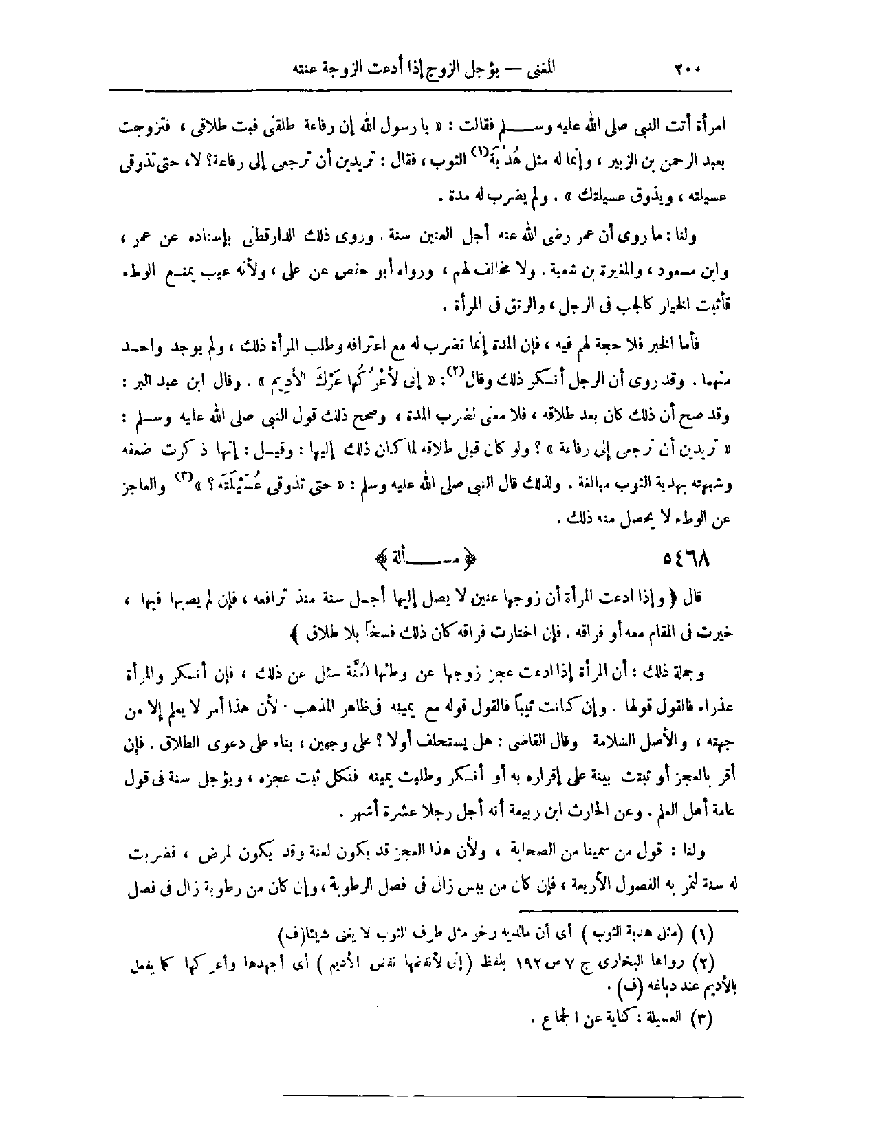 امْرَأَةً أَتَتْ النَّبِيَّ - صَلَّى اللَّهُ عَلَيْهِ وَسَلَّمَ - فَقَالَتْ: «يَا رَسُولَ اللَّهِ، إنَّ رِفَاعَةَ طَلَّقَنِي، فَبَتَّ طَلَاقِي، فَتَزَوَّجْت بِعَبْدِ الرَّحْمَنِ بْنِ الزُّبَيْرِ، وَإِنَّمَا لَهُ مِثْلُ هُدْبَةِ الثَّوْبِ، فَقَالَ: تُرِيدِينَ أَنْ تَرْجِعِي إلَى رِفَاعَةَ؟ لَا حَتَّى تَذُوقِي عُسَيْلَتَهُ، وَيَذُوقَ عُسَيْلَتَك» . وَلَمْ يَضْرِبْ لَهُ مُدَّةً. وَلَنَا، مَا رُوِيَ أَنَّ عُمَرَ - رَضِيَ اللَّهُ عَنْهُ - أَجَّلَ الْعِنِّينَ سَنَةً. وَرَوَى ذَلِكَ الدَّارَقُطْنِيّ، بِإِسْنَادِهِ عَنْ عُمَرَ وَابْنِ مَسْعُودٍ، وَالْمُغِيرَةِ بْنِ شُعْبَةَ وَلَا مُخَالِفَ لَهُمْ. وَرَوَاهُ أَبُو حَفْصٍ عَنْ عَلِيٍّ وَلِأَنَّهُ عَيْبٌ يَمْنَعُ الْوَطْءَ، فَأَثْبَتَ الْخِيَارَ، كَالْجَبِّ فِي الرَّجُلِ، وَالرَّتْقِ فِي الْمَرْأَةِ، فَأَمَّا الْخَبَرُ، فَلَا حُجَّةَ لَهُمْ فِيهِ؛ فَإِنَّ الْمُدَّةَ إنَّمَا تُضْرَبُ لَهُ مَعَ اعْتِرَافِهِ، وَطَلَبِ الْمَرْأَةِ ذَلِكَ، وَلَمْ يُوجَدْ وَاحِدٌ مِنْهُمَا