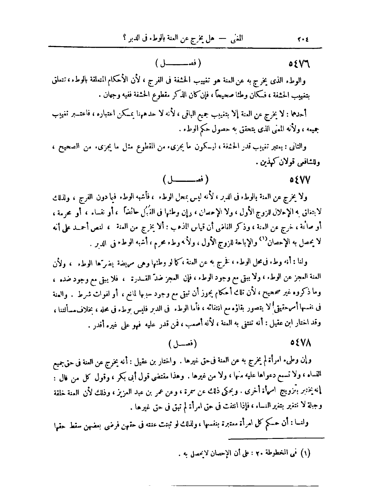 (٥٥٤٠) فَصْلٌ: وَالْوَطْءُ الَّذِي يَخْرُجُ بِهِ عَنْ الْعُنَّةِ، هُوَ تَغْيِيبُ الْحَشَفَةِ فِي الْفَرْجِ؛ لِأَنَّ الْأَحْكَامَ الْمُتَعَلِّقَةَ بِالْوَطْءِ تَتَعَلَّقُ بِتَغْيِيبِ الْحَشَفَةِ، فَكَانَ وَطْئًا صَحِيحًا، فَإِنْ كَانَ الذَّكَرُ مَقْطُوعَ الْحَشَفَةِ، فَفِيهِ وَجْهَانِ؛ أَحَدُهُمَا، لَا يَخْرُجُ عَنْ الْعُنَّةِ إلَّا بِتَغْيِيبِ جَمِيعِ الْبَاقِي؛ لِأَنَّهُ لَا حَدَّ هَاهُنَا يُمْكِنُ اعْتِبَارُهُ، فَاعْتُبِرَ تَغْيِيبُ جَمِيعِهِ؛ لِأَنَّهُ الْمَعْنَى الَّذِي يَتَحَقَّقُ بِهِ حُصُولُ حُكْمِ الْوَطْءِ. وَالثَّانِي، يُعْتَبَرُ تَغْيِيبُ قَدْرِ الْحَشَفَةِ، لِيَكُونَ مَا يُجْزِئُ مِنْ الْمَقْطُوعِ مِثْلُ مَا يُجْزِئُ مِنْ الصَّحِيحِ