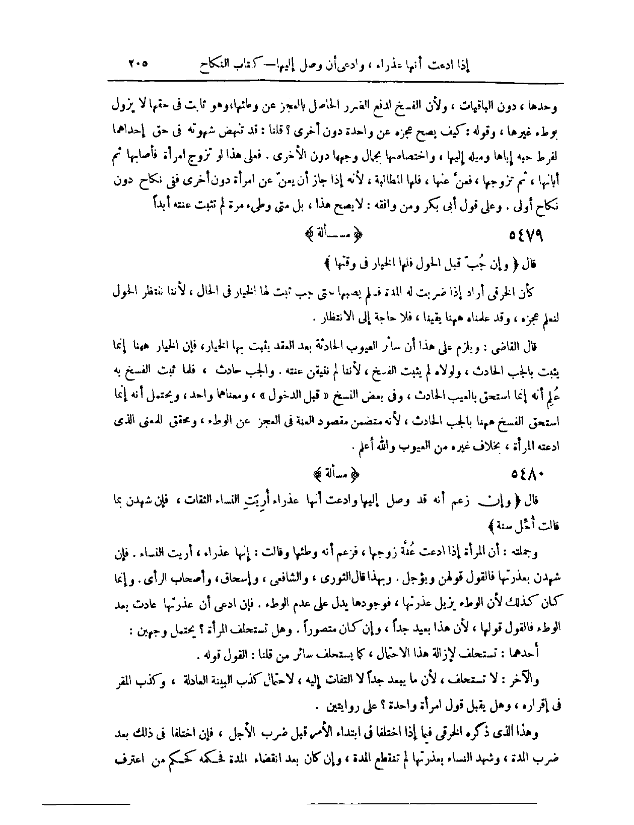 وَحْدَهَا دُونَ الْبَاقِيَاتِ، وَلِأَنَّ الْفَسْخَ لِدَفْعِ الضَّرَرِ الْحَاصِلِ بِالْعَجْزِ عَنْ وَطْئِهَا، وَهُوَ ثَابِتٌ فِي حَقِّهَا لَا يَزُولُ بِوَطْءِ غَيْرِهَا. وَقَوْلُهُ: كَيْفَ يَصِحُّ عَجْزُهُ عَنْ وَاحِدَةٍ دُونَ أُخْرَى؟ قُلْنَا: قَدْ تَنْهَضُ شَهْوَتُهُ فِي حَقِّ إحْدَاهُمَا، لِفَرْطِ حُبِّهِ إيَّاهَا، وَمَيْلِهِ إلَيْهَا، وَاخْتِصَاصِهَا بِجَمَالٍ وَنَحْوِهِ دُونَ الْأُخْرَى. فَعَلَى هَذَا، لَوْ تَزَوَّجَ امْرَأَةً فَأَصَابَهَا، ثُمَّ أَبَانَهَا، ثُمَّ تَزَوَّجَهَا، فَعَنَّ عَنْهَا، فَلَهَا الْمُطَالَبَةُ؛ لِأَنَّهُ إذَا جَازَ أَنْ يَعِنَّ عَنْ امْرَأَةٍ دُونَ أُخْرَى، فَفِي نِكَاحٍ دُون نِكَاحٍ أَوْلَى. وَعَلَى قَوْلِ أَبِي بَكْرٍ وَمَنْ وَافَقَهُ: لَا يَصِحُّ هَذَا، بَلْ مَتَى وَطِئَ مَرَّةً، لَمْ تَثْبُتْ عُنَّتُهُ أَبَدًا.