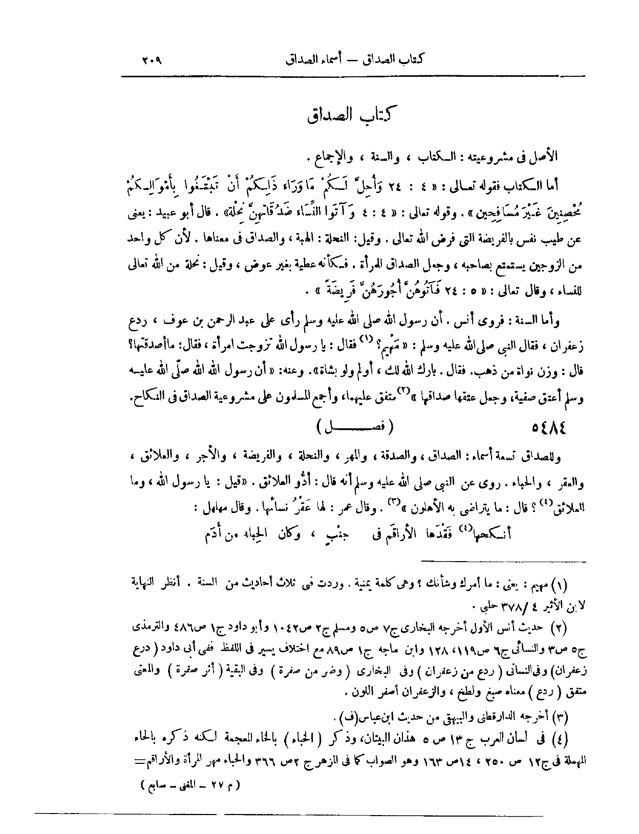 ِ الْأَصْلُ فِي مَشْرُوعِيَّتِهِ الْكِتَابُ وَالسُّنَّةُ وَالْإِجْمَاعُ؛ أَمَّا الْكِتَابُ فَقَوْلُهُ تَعَالَى: {وَأُحِلَّ لَكُمْ مَا وَرَاءَ ذَلِكُمْ أَنْ تَبْتَغُوا بِأَمْوَالِكُمْ مُحْصِنِينَ غَيْرَ مُسَافِحِينَ} [النساء: ٢٤] وَقَالَ تَعَالَى: {وَآتُوا النِّسَاءَ صَدُقَاتِهِنَّ نِحْلَةً} [النساء: ٤] . قَالَ أَبُو عُبَيْدٍ: يَعْنِي عَنْ طِيبِ نَفْسٍ، بِالْفَرِيضَةِ الَّتِي فَرَضَ اللَّهُ تَعَالَى. وَقِيلَ: النِّحْلَةُ: الْهِبَةُ، وَالصَّدَاقُ فِي مَعْنَاهَا؛ لِأَنَّ كُلَّ وَاحِدٍ مِنْ الزَّوْجَيْنِ يَسْتَمْتِعُ بِصَاحِبِهِ، وَجَعَلَ الصَّدَاقَ لِلْمَرْأَةِ، فَكَأَنَّهُ عَطِيَّةٌ بِغَيْرِ عِوَضٍ.