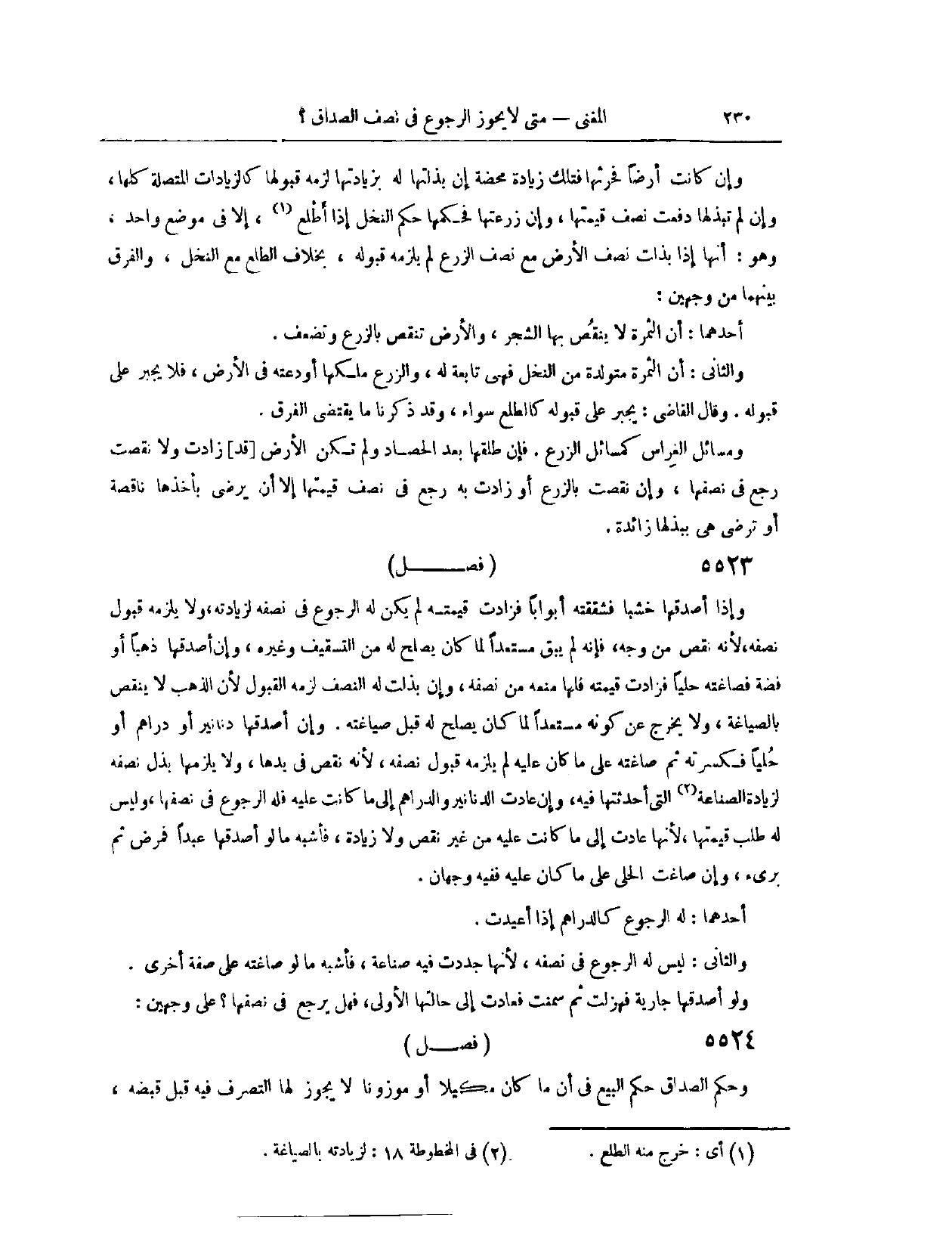 (٥٥٨٧) فَصْلٌ: وَإِذَا أَصْدَقَهَا خَشَبًا فَشَقَّتْهُ أَبْوَابًا، فَزَادَتْ قِيمَتُهُ، لَمْ يَكُنْ لَهُ الرُّجُوعُ فِي نِصْفِهِ لِزِيَادَتِهِ، وَلَا يَلْزَمُهُ قَبُولُ نِصْفِهِ؛ لِأَنَّهُ نَقَصَ مِنْ وَجْهٍ فَإِنَّهُ لَمْ يَبْقَ مُسْتَعِدًّا لِمَا كَانَ يَصْلُحُ لَهُ مِنْ التَّسْقِيفِ وَغَيْرِهِ. وَإِنْ أَصْدَقَهَا ذَهَبًا أَوْ فِضَّةً، فَصَاغَتْهُ حُلِيًّا فَزَادَتْ قِيمَتُهُ، فَلَهَا مَنْعُهُ مِنْ نِصْفِهِ. وَإِنْ بَذَلَتْ لَهُ النِّصْفَ، لَزِمَهُ الْقَبُولُ، لِأَنَّ الذَّهَبَ لَا يَنْقُصُ بِالصِّيَاغَةِ، وَلَا يَخْرُجُ عَنْ كَوْنِهِ مُسْتَعِدًّا لِمَا كَانَ يَصْلُحُ لَهُ قَبْلَ صِيَاغَتِهِ، وَإِنْ أَصْدَقَهَا دَنَانِيرَ أَوْ دَرَاهِمَ أَوْ حُلِيًّا، فَكَسَرَتْهُ، ثُمَّ صَاغَتْهُ عَلَى غَيْرِ مَا كَانَ عَلَيْهِ، لَمْ يَلْزَمْهُ قَبُولُ نِصْفِهِ، لِأَنَّهُ نَقَصَ فِي يَدِهَا، وَلَا يَلْزَمُهَا بَذْلُ نِصْفِهِ؛ لِزِيَادَةِ الصِّنَاعَةِ الَّتِي أَحْدَثَتْهَا فِيهِ، وَإِنْ عَادَتْ الدَّنَانِيرُ وَالدَّرَاهِمُ إلَى مَا كَانَتْ عَلَيْهِ، فَلَهُ الرُّجُوعُ فِي نِصْفِهَا، وَلَيْسَ لَهُ طَلَبُ قِيمَتِهَا؛ لِأَنَّهَا عَادَتْ إلَى مَا كَانَتْ عَلَيْهِ مِنْ غَيْرِ نَقْصٍ وَلَا زِيَادَةٍ، فَأَشْبَهَ مَا لَوْ أَصْدَقَهَا عَبْدًا فَمَرِضَ ثُمَّ بَرِيءَ.
