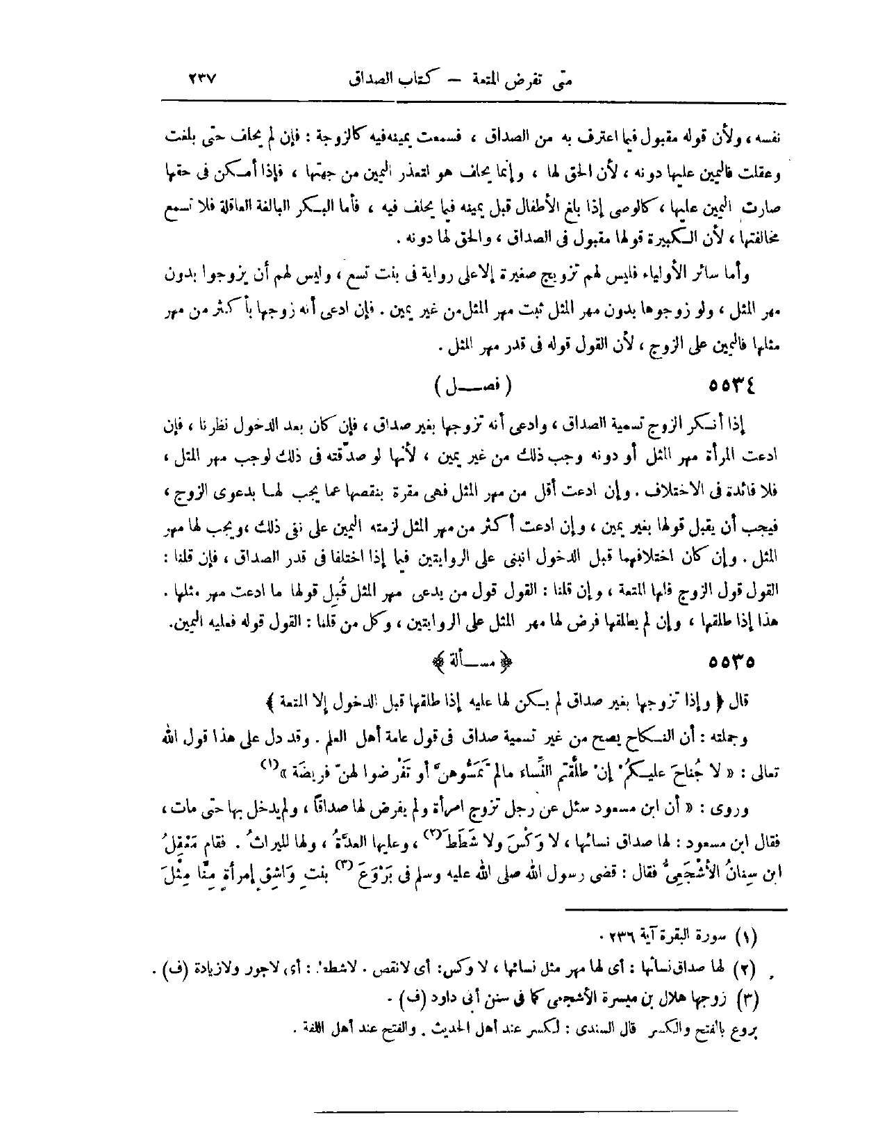 (٥٥٩٩) مَسْأَلَةٌ؛ قَالَ: وَإِذَا تَزَوَّجَهَا بِغَيْرِ صَدَاقٍ، لَمْ يَكُنْ لَهَا عَلَيْهِ إذَا طَلَّقَهَا قَبْلَ الدُّخُولِ إلَّا الْمُتْعَةُ. وَجُمْلَتُهُ أَنَّ النِّكَاحَ يَصِحُّ مِنْ غَيْرِ تَسْمِيَةِ صَدَاقٍ، فِي قَوْلِ عَامَّةِ أَهْلِ الْعِلْمِ. وَقَدْ دَلَّ عَلَى هَذَا قَوْلُ اللَّهِ تَعَالَى {لا جُنَاحَ عَلَيْكُمْ إِنْ طَلَّقْتُمُ النِّسَاءَ مَا لَمْ تَمَسُّوهُنَّ أَوْ تَفْرِضُوا لَهُنَّ فَرِيضَةً} [البقرة: ٢٣٦] وَمَتِّعُوهُنَّ وَرُوِيَ «أَنَّ ابْنَ مَسْعُودٍ سُئِلَ عَنْ رَجُلٍ تَزَوَّجَ امْرَأَةً، وَلَمْ يَفْرِضْ لَهَا صَدَاقًا، وَلَمْ يَدْخُلْ بِهَا حَتَّى مَاتَ، فَقَالَ ابْنُ مَسْعُودٍ: لَهَا صَدَاقُ نِسَائِهَا، لَا وَكْسَ وَلَا شَطَطَ، وَعَلَيْهَا الْعِدَّةُ، وَلَهَا الْمِيرَاثُ. فَقَامَ مَعْقِلُ بْنُ سِنَانٍ الْأَشْجَعِيُّ، فَقَالَ: قَضَى رَسُولُ اللَّهِ - صَلَّى اللَّهُ عَلَيْهِ وَسَلَّمَ - فِي بِرْوَعَ بِنْتِ وَاشِقٍ، امْرَأَةٍ مِنَّا مِثْلَ