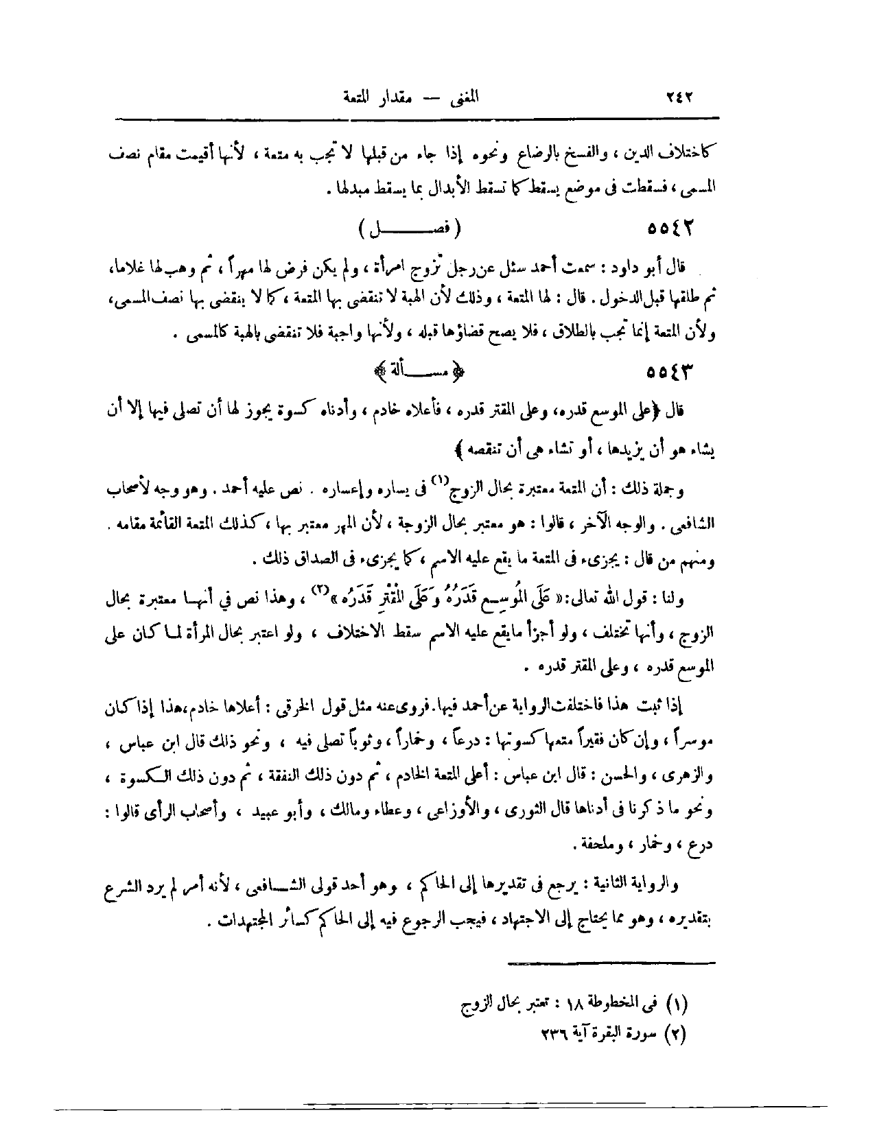 (٥٦٠٧) مَسْأَلَةٌ؛ قَالَ: (عَلَى الْمُوسِعِ قَدَرُهُ، وَعَلَى الْمُقْتِرِ قَدَرُهُ، فَأَعْلَاهُ خَادِمٌ، وَأَدْنَاهُ كُسْوَةٌ يَجُوزُ لَهَا أَنْ تُصَلِّيَ فِيهَا، إلَّا أَنْ يَشَاءَ هُوَ أَنْ يُزِيدَهَا، أَوْ تَشَاءَ هِيَ أَنْ تُنْقِصَهُ) وَجُمْلَةُ ذَلِكَ أَنَّ الْمُتْعَةَ مُعْتَبَرَةٌ بِحَالِ الزَّوْجِ، فِي يَسَارِهِ وَإِعْسَارِهِ. نَصَّ عَلَيْهِ أَحْمَدُ. وَهُوَ وَجْهٌ لِأَصْحَابِ الشَّافِعِيِّ. وَالْوَجْهُ الْآخِرُ قَالُوا: هُوَ مُعْتَبَرٌ بِحَالِ الزَّوْجَةِ؛ لِأَنَّ الْمَهْرَ مُعْتَبَرٌ بِهَا، كَذَلِكَ الْمُتْعَةُ الْقَائِمَةُ مَقَامَهُ. وَمِنْهُمْ مَنْ قَالَ: يُجْزِئُ فِي الْمُتْعَةِ مَا يَقَعُ عَلَيْهِ الِاسْمُ، كَمَا يُجْزِئُ فِي الصَّدَاقِ ذَلِكَ.