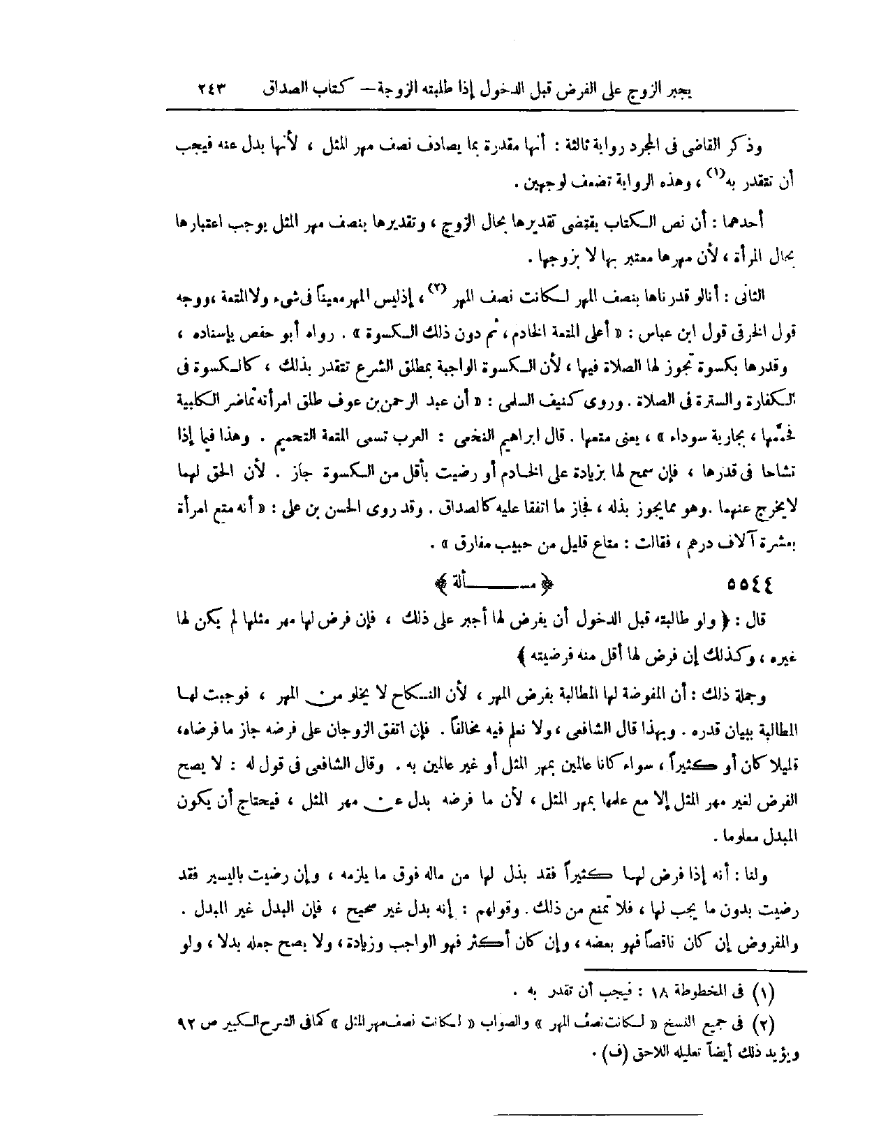(٥٦٠٨) مَسْأَلَةٌ؛ قَالَ: (وَلَوْ طَالَبَتْهُ قَبْلَ الدُّخُولِ أَنْ يَفْرِضَ لَهَا، أُجْبِرَ عَلَى ذَلِكَ. فَإِنْ فَرَضَ لَهَا مَهْرَ مِثْلهَا لَمْ يَكُنْ لَهَا غَيْرُهُ، وَكَذَلِكَ إنْ فَرَضَ لَهَا أَقَلَّ مِنْهُ فَرَضِيتَهُ) وَجُمْلَةُ ذَلِكَ أَنَّ الْمُفَوِّضَةَ لَهَا الْمُطَالَبَةُ بِفَرْضِ الْمَهْرِ؛ لِأَنَّ النِّكَاحَ لَا يَخْلُو مِنْ الْمَهْرِ فَوَجَبَتْ لَهَا الْمُطَالَبَةُ بِبَيَانِ قَدْرِهِ. وَبِهَذَا قَالَ الشَّافِعِيُّ. وَلَا نَعْلَمُ فِيهِ مُخَالِفًا. فَإِنْ اتَّفَقَ الزَّوْجَانِ عَلَى فَرْضِهِ، جَازَ مَا فَرَضَاهُ، قَلِيلًا كَانَ أَوْ كَثِيرًا، سَوَاءٌ كَانَا عَالِمَيْنِ بِمَهْرِ الْمِثْلِ أَوْ غَيْرَ عَالَمِينَ بِهِ.