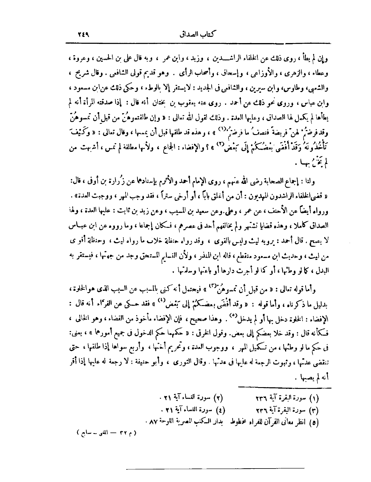 وَأَمَّا قَوْلُهُ: {وَقَدْ أَفْضَى بَعْضُكُمْ إِلَى بَعْضٍ} [النساء: ٢١] فَقَدْ حُكِيَ عَنْ الْفَرَّاءِ، أَنَّهُ قَالَ: الْإِفْضَاءُ الْخَلْوَةُ، دَخَلَ بِهَا أَوْ لَمْ يَدْخُلْ. وَهَذَا صَحِيحٌ؛ فَإِنَّ الْإِفْضَاءَ مَأْخُوذٌ مِنْ الْفَضَاءِ، وَهُوَ الْخَالِي، فَكَأَنَّهُ قَالَ: وَقَدْ خَلَا بَعْضُكُمْ إلَى بَعْضٍ. وَقَوْلُ الْخِرَقِيِّ: حُكْمُهَا حُكْمُ الدُّخُولِ فِي جَمِيعِ أُمُورِهِمَا. يَعْنِي فِي حُكْمِ مَا لَوْ وَطِئَهَا، مِنْ تَكْمِيلِ الْمَهْرِ، وَوُجُوبِ الْعِدَّةِ، وَتَحْرِيمِ أُخْتِهَا وَأَرْبَعٍ سِوَاهَا إذَا طَلَّقَهَا حَتَّى تَنْقَضِيَ عِدَّتُهَا، وَثُبُوتِ الرَّجْعَةِ لَهُ عَلَيْهَا فِي عِدَّتِهَا. وَقَالَ الثَّوْرِيُّ، وَأَبُو حَنِيفَةَ: لَا رَجْعَةَ لَهُ عَلَيْهَا، إذَا أَقَرَّ أَنَّهُ لَمْ يُصِبْهَا.