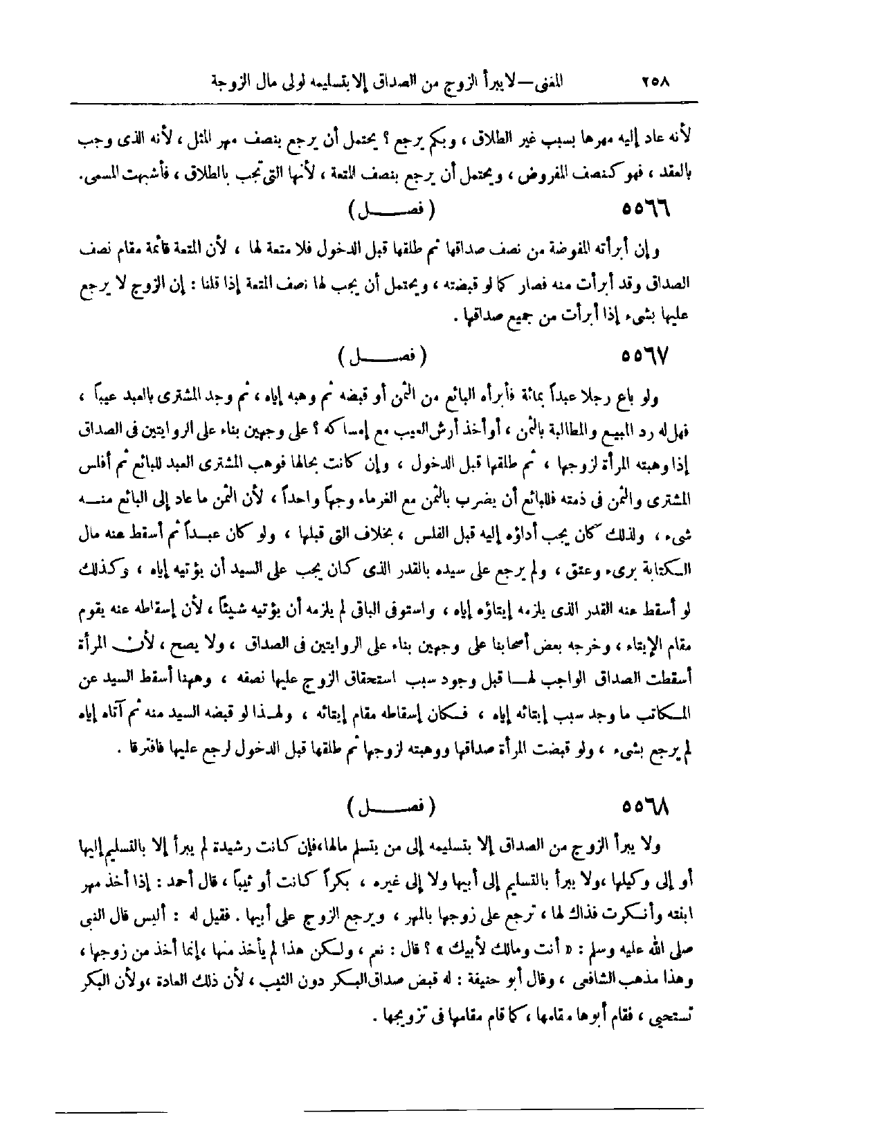 (٥٦٣٣) فَصْلٌ: وَلَا يَبْرَأُ الزَّوْجُ مِنْ الصَّدَاقِ إلَّا بِتَسْلِيمِهِ إلَى مَنْ يَتَسَلَّمُ مَالَهَا، فَإِنْ كَانَتْ رَشِيدَةً، لَمْ يَبْرَأْ إلَّا بِالتَّسْلِيمِ إلَيْهَا، أَوْ إلَى وَكِيلِهَا، وَلَا يَبْرَأُ بِالتَّسْلِيمِ إلَى أَبِيهَا وَلَا إلَى غَيْرِهِ؛ بِكْرًا كَانَتْ أَوْ ثَيِّبًا. قَالَ أَحْمَدُ: إذَا أَخَذَ مَهْرَ ابْنَتِهِ، وَأَنْكَرَتْ، فَذَاكَ لَهَا، تَرْجِعُ عَلَى زَوْجِهَا بِالْمَهْرِ، وَيَرْجِعُ الزَّوْجُ عَلَى أَبِيهَا. فَقِيلَ لَهُ: أَلَيْسَ قَالَ النَّبِيُّ - صَلَّى اللَّهُ عَلَيْهِ وَسَلَّمَ -: «أَنْتَ وَمَالُك لِأَبِيكَ» ؟ قَالَ: نَعَمْ، وَلَكِنَّ هَذَا لَمْ يَأْخُذْ مِنْهَا، إنَّمَا أَخَذَ مِنْ زَوْجِهَا. وَهَذَا مَذْهَبُ الشَّافِعِيِّ وَقَالَ أَبُو حَنِيفَةَ: لَهُ قَبْضُ صَدَاقِ الْبِكْرِ دُونَ الثَّيِّبِ؛ لِأَنَّ ذَلِكَ الْعَادَةُ، وَلِأَنَّ الْبِكْرَ تَسْتَحِي، فَقَامَ أَبُوهَا مَقَامَهَا، كَمَا قَامَ مَقَامَهَا فِي تَزْوِيجِهَا.