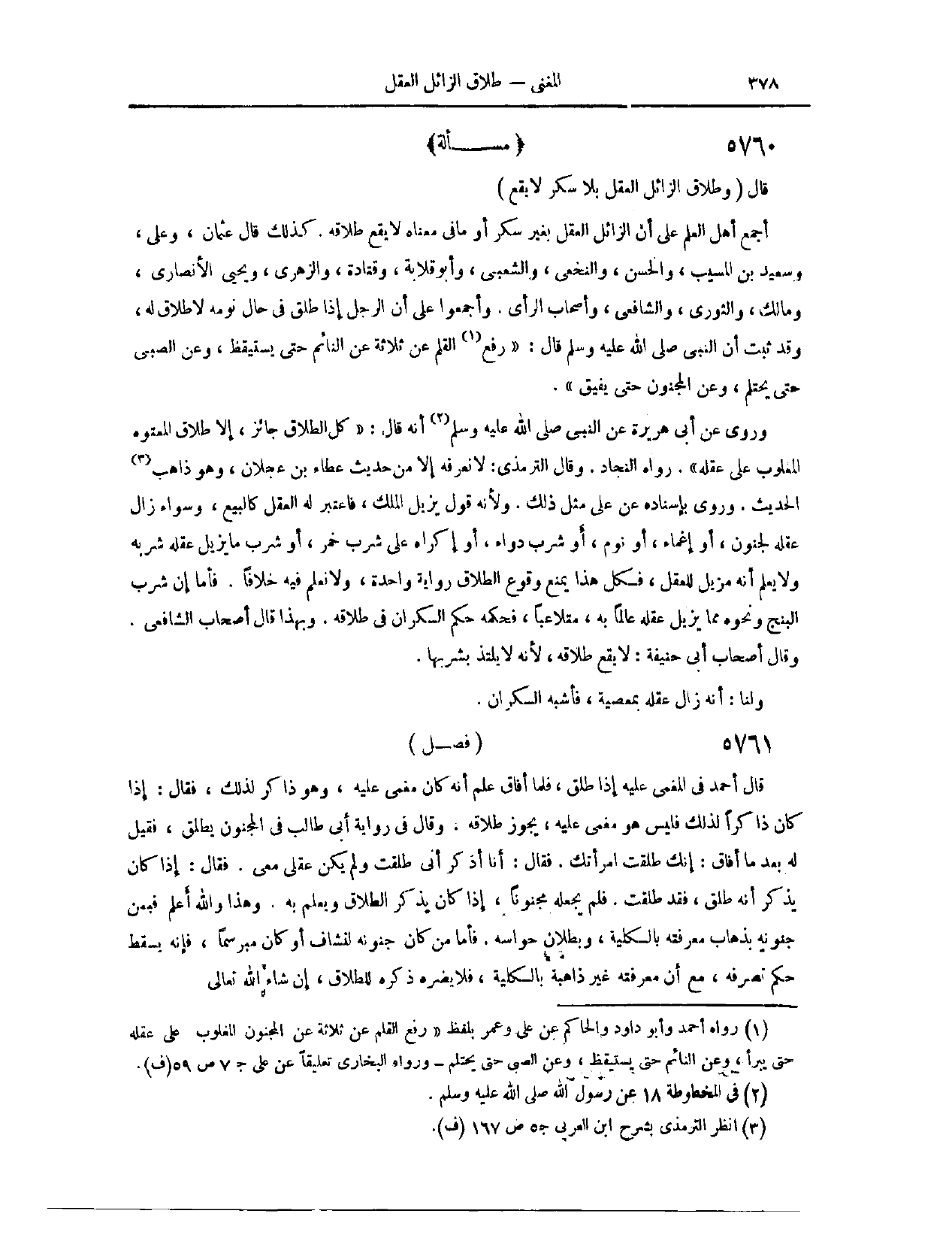 وَقَدْ ثَبَتَ أَنَّ النَّبِيَّ - صَلَّى اللَّهُ عَلَيْهِ وَسَلَّمَ - قَالَ: «رُفِعَ الْقَلَمُ عَنْ ثَلَاثَةٍ؛ عَنْ النَّائِم حَتَّى يَسْتَيْقِظَ، وَعَنْ الصَّبِيِّ حَتَّى يَحْتَلِمَ، وَعَنْ الْمَجْنُونِ حَتَّى يُفِيقَ.» وَرُوِيَ عَنْ أَبِي هُرَيْرَةَ، عَنْ النَّبِيِّ - صَلَّى اللَّهُ عَلَيْهِ وَسَلَّمَ - أَنَّهُ قَالَ: «كُلُّ الطَّلَاقِ جَائِزٌ، إلَّا طَلَاقَ الْمَعْتُوهِ الْمَغْلُوبِ عَلَى عَقْلِهِ.» رَوَاهُ النَّجَّادُ. وَقَالَ التِّرْمِذِيُّ: لَا نَعْرِفُهُ إلَّا مِنْ حَدِيثِ عَطَاءِ بْنِ عَجْلَانَ، وَهُوَ ذَاهِبُ الْحَدِيثِ. وَرُوِيَ بِإِسْنَادٍ عَنْ عَلِيٍّ مِثْلُ ذَلِكَ. وَلِأَنَّهُ قَوْلٌ يُزِيلُ الْمِلْكَ، فَاعْتُبِرَ لَهُ الْعَقْلُ، كَالْبَيْعِ.