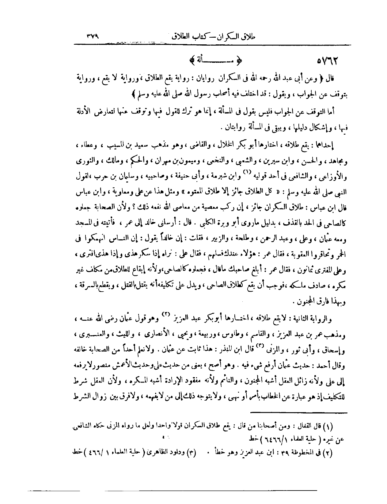 (٥٨٣٩) مَسْأَلَةٌ؛ قَالَ: (وَعَنْ أَبِي عَبْدِ اللَّهِ رَحِمَهُ اللَّهُ، فِي السَّكْرَانِ رِوَايَاتٌ؛ رِوَايَةٌ يَقَعُ الطَّلَاقُ. وَرِوَايَةٌ لَا يَقَعُ. وَرِوَايَةٌ يَتَوَقَّفُ عَنْ الْجَوَابِ، وَيَقُولُ: قَدْ اخْتَلَفَ فِيهِ أَصْحَابُ رَسُولِ اللَّهِ) - صَلَّى اللَّهُ عَلَيْهِ وَسَلَّمَ - أَمَّا التَّوَقُّفُ عَنْ الْجَوَابِ، فَلَيْسَ بِقَوْلٍ فِي الْمَسْأَلَةِ، إنَّمَا هُوَ تَرْكٌ لِلْقَوْلِ فِيهَا، وَتَوَقُّفٌ عَنْهَا، لِتَعَارُضِ الْأَدِلَّةِ فِيهَا، وَإِشْكَالِ دَلِيلِهَا. وَيَبْقَى فِي الْمَسْأَلَةِ رِوَايَتَانِ: إحْدَاهُمَا، يَقَعُ طَلَاقُهُ. اخْتَارَهَا أَبُو بَكْرٍ الْخَلَّالُ، وَالْقَاضِي. وَهُوَ مَذْهَبُ سَعِيدِ بْنِ الْمُسَيِّبِ، وَعَطَاءٍ، وَمُجَاهِدٍ، وَالْحَسَنِ، وَابْنِ سِيرِينَ، وَالشَّعْبِيِّ، وَالنَّخَعِيِّ، وَمَيْمُونِ بْنِ مِهْرَانَ، وَالْحَكَمِ، وَمَالِكٍ، وَالثَّوْرِيِّ، وَالْأَوْزَاعِيِّ، وَالشَّافِعِيِّ فِي أَحَدِ قَوْلَيْهِ وَابْنِ شُبْرُمَةَ، وَأَبِي حَنِيفَةَ، وَصَاحِبَيْهِ، وَسُلَيْمَانَ بْنِ حَرْبٍ؛ لِقَوْلِ النَّبِيِّ - صَلَّى اللَّهُ عَلَيْهِ وَسَلَّمَ -: «كُلُّ الطَّلَاقِ جَائِزٌ، إلَّا طَلَاقَ الْمَعْتُوهِ» .