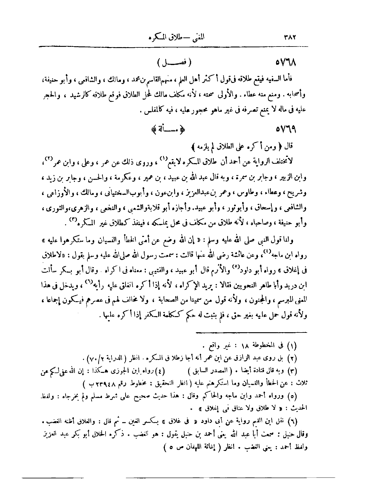 (٥٨٤٦) مَسْأَلَةٌ؛ قَالَ: (وَمَنْ أُكْرِهَ عَلَى الطَّلَاقِ، لَمْ يَلْزَمْهُ) لَا تَخْتَلِفُ الرِّوَايَةُ عَنْ أَحْمَدَ، أَنَّ طَلَاقَ الْمُكْرَهِ لَا يَقَعُ. وَرُوِيَ ذَلِكَ عَنْ عُمَرَ، وَعَلِيٍّ، وَابْنِ عُمَرَ وَابْنِ عَبَّاسٍ، وَابْنِ الزُّبَيْرِ، وَجَابِرِ بْنِ سَمُرَةَ. وَبِهِ قَالَ عَبْدُ اللَّهِ بْنُ عُبَيْدِ بْنِ عُمَيْرٍ، وَعِكْرِمَةُ، وَالْحَسَنُ، وَجَابِرُ بْنُ زَيْدٍ، وَشُرَيْحٌ، وَعَطَاءٌ، وَطَاوُسٌ، وَعُمَرُ بْنُ عَبْدِ الْعَزِيزِ، وَابْنُ عَوْنٍ، وَأَيُّوبُ السِّخْتِيَانِيُّ، وَمَالِكٌ، وَالْأَوْزَاعِيُّ، وَالشَّافِعِيُّ، وَإِسْحَاقُ وَأَبُو ثَوْرٍ، وَأَبُو عُبَيْدٍ. وَأَجَازَهُ أَبُو قِلَابَةَ، وَالشَّعْبِيُّ، وَالنَّخَعِيُّ، وَالزُّهْرِيُّ وَالثَّوْرِيُّ، وَأَبُو حَنِيفَةَ وَصَاحِبَاهُ؛ لِأَنَّهُ طَلَاقٌ مِنْ مُكَلَّفٍ، فِي مَحَلٍّ يَمْلِكُهُ، فَيَنْفُذُ، كَطَلَاقِ غَيْرِ الْمُكْرَهِ.