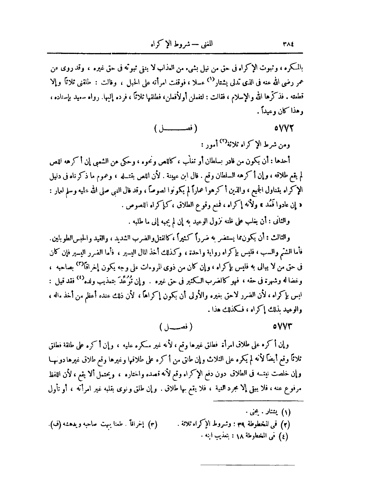 (٥٨٤٩) فَصْلٌ: وَمِنْ شَرْطِ الْإِكْرَاهِ ثَلَاثَةُ أُمُورٍ؛ أَحَدُهَا: أَنْ يَكُونَ مِنْ قَادِرٍ بِسُلْطَانِ أَوْ تَغَلُّبٍ، كَاللِّصِّ وَنَحْوِهِ. وَحُكِيَ عَنْ الشَّعْبِيِّ: إنَّ أَكْرَهَهُ اللِّصُّ، لَمْ يَقَعْ طَلَاقُهُ، وَإِنْ أَكْرَهَهُ السُّلْطَانُ وَقَعَ. قَالَ ابْنُ عُيَيْنَةَ: لِأَنَّ اللِّصَّ يَقْتُلُهُ. وَعُمُومُ مَا ذَكَرْنَاهُ فِي دَلِيلِ الْإِكْرَاهِ يَتَنَاوَلُ الْجَمِيعَ، وَاَلَّذِينَ أَكْرَهُوا عَمَّارًا لَمْ يَكُونُوا لُصُوصًا، وَقَدْ قَالَ النَّبِيُّ - صَلَّى اللَّهُ عَلَيْهِ وَسَلَّمَ - لَعَمَّارٍ: «إنْ عَادُوا فَعُدْ» . وَلِأَنَّهُ إكْرَاهٌ، فَمَنَعَ وُقُوعَ الطَّلَاقِ، كَإِكْرَاهِ اللُّصُوصِ. الثَّانِي، أَنْ يَغْلِبَ عَلَى ظَنِّهِ نُزُولُ الْوَعِيدِ بِهِ، إنْ لَمْ يُجِبْهُ إلَى مَا طَلَبَهُ. الثَّالِثُ، أَنْ يَكُونَ مِمَّا يَسْتَضِرُّ بِهِ ضَرَرًا كَثِيرًا، كَالْقَتْلِ، وَالضَّرْبِ الشَّدِيدِ، وَالْقَيْدِ، وَالْحَبْسِ الطَّوِيلِ، فَأَمَّا الشَّتْمُ، وَالسَّبُّ، فَلَيْسَ بِإِكْرَاهٍ، رِوَايَةً وَاحِدَةً، وَكَذَلِكَ أَخْذُ الْمَالِ الْيَسِيرِ.