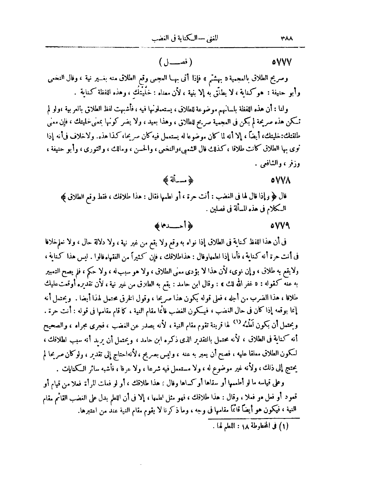 (٥٨٥٥) مَسْأَلَةٌ؛ قَالَ: (وَإِذَا قَالَ لَهَا فِي الْغَضَبِ: أَنْتِ حُرَّةٌ، أَوْ لَطَمَهَا، فَقَالَ: هَذَا طَلَاقُك فَقَدْ وَقَعَ الطَّلَاقُ) الْكَلَامُ فِي هَذِهِ الْمَسْأَلَةِ فِي فَصْلَيْنِ: (٥٨٥٦) الْفَصْلُ الْأَوَّلُ: فِي أَنَّ هَذَا اللَّفْظَ كِنَايَةٌ فِي الطَّلَاقِ، إذَا نَوَاهُ بِهِ وَقَعَ، وَلَا يَقَعُ مِنْ غَيْرِ نِيَّةٍ، وَلَا دَلَالَةِ حَالٍ، وَلَا نَعْلَمُ خِلَافًا فِي: أَنْتَ حُرَّةٌ، أَنَّهُ كِنَايَةٌ. فَأَمَّا إذَا لَطَمَهَا، وَقَالَ: هَذَا طَلَاقُك. فَإِنَّ كَثِيرًا مِنْ الْفُقَهَاءِ قَالُوا: لَيْسَ هَذَا كِنَايَةً، وَلَا يَقَعُ بِهِ طَلَاقٌ، وَإِنْ نَوَى؛ لِأَنَّ هَذَا لَا يُؤَدِّي مَعْنَى الطَّلَاقِ، وَلَا هُوَ سَبَبٌ لَهُ، وَلَا حُكْمٌ فَلَمْ يَصِحَّ التَّعْبِيرُ بِهِ عَنْهُ، كَقَوْلِهِ: غَفَرَ اللَّهُ لَك. وَقَالَ ابْنُ حَامِدٍ: يَقَعُ بِهِ الطَّلَاقُ مِنْ غَيْرِ نِيَّةٍ؛ لِأَنَّ تَقْدِيرَهُ: أَوْقَعْت عَلَيْك طَلَاقًا، هَذَا الضَّرْبُ مِنْ أَجْلِهِ، فَعَلَى قَوْلِهِ يَكُونُ هَذَا صَرِيحًا.
