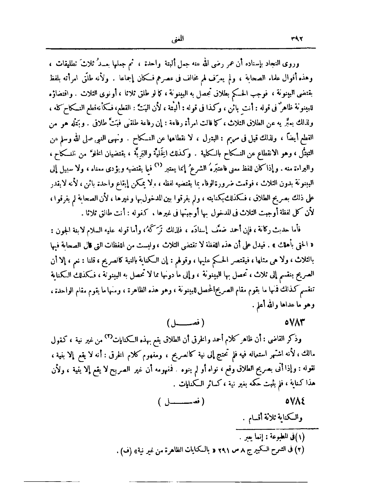 فَيَدُلُّ عَلَى أَنَّ هَذِهِ اللَّفْظَةَ لَا تَقْتَضِي الثَّلَاثَ، وَلَيْسَتْ مِنْ اللَّفَظَاتِ الَّتِي قَالَ الصَّحَابَةُ فِيهَا بِالثَّلَاثِ، وَلَا هِيَ مِثْلُهَا، فَيُقْصَرُ الْحُكْمُ عَلَيْهَا. وَقَوْلُهُمْ: إنَّ الْكِنَايَةَ بِالنِّيَّةِ كَالصَّرِيحِ. قُلْنَا: نَعَمْ، إلَّا أَنَّ الصَّرِيحَ يَنْقَسِمُ إلَى ثَلَاثٍ تَحْصُلُ بِهَا الْبَيْنُونَةُ، وَإِلَى مَا دُونَهَا مِمَّا لَا تَحْصُلُ بِهِ الْبَيْنُونَةُ، فَكَذَلِكَ الْكِنَايَةُ تَنْقَسِمُ كَذَلِكَ، فَمِنْهَا مَا يَقُومُ مَقَامَ الصَّرِيحِ الْمُحَصِّلِ لِلْبَيْنُونَةِ، وَهُوَ هَذِهِ الظَّاهِرَةُ، وَمِنْهَا مَا يَقُومُ مَقَامَ الْوَاحِدَةِ، وَهُوَ مَا عَدَاهَا، وَاَللَّهُ أَعْلَمُ. (٥٨٦٠) فَصْلٌ: وَذَكَرَ الْقَاضِي أَنَّ ظَاهِرَ كَلَامِ أَحْمَدَ، وَالْخِرَقِيِّ؛ أَنَّ الطَّلَاقَ يَقَعُ بِهَذِهِ الْكِنَايَاتِ مِنْ غَيْرِ نِيَّةٍ، كَقَوْلِ مَالِكٍ؛ لِأَنَّهُ اشْتَهَرَ اسْتِعْمَالُهَا فِيهِ، فَلَمْ تَحْتَجْ إلَى نِيَّةٍ كَالصَّرِيحِ.