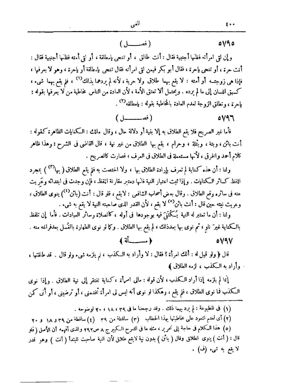(٥٨٧٣) فَصْلٌ: فَأَمَّا غَيْرُ الصَّرِيحِ؛ فَلَا يَقَعُ الطَّلَاقُ بِهِ إلَّا بِنِيَّةٍ، أَوْ دَلَالَةِ حَالٍ. وَقَالَ مَالِكٌ الْكِنَايَاتُ الظَّاهِرَةُ، كَقَوْلِهِ: أَنْتِ بَائِنٌ، وَبَتَّةٌ، وَبَتْلَةٌ، وَحَرَامٌ. يَقَعُ بِهَا الطَّلَاقُ مِنْ غَيْرِ نِيَّةٍ. قَالَ الْقَاضِي، فِي " الشَّرْحِ ": وَهَذَا ظَاهِرُ كَلَامِ أَحْمَدَ، وَالْخِرَقِيِّ؛ لِأَنَّهَا مُسْتَعْمَلَةٌ فِي الطَّلَاقِ فِي الْعُرْفِ، فَصَارَتْ كَالصَّرِيحِ. وَلَنَا، أَنَّ هَذِهِ كِنَايَةٌ لَمْ تُعْرَفْ بِإِرَادَةِ الطَّلَاقِ بِهَا، وَلَا اخْتَصَّتْ بِهِ، فَلَمْ يَقَعْ الطَّلَاقُ بِهَا بِمُجَرَّدِ اللَّفْظِ، كَسَائِرِ الْكِنَايَاتِ، وَإِذَا ثَبَتَ اعْتِبَارُ النِّيَّةِ، فَإِنَّهَا تُعْتَبَرُ مُقَارِنَةً لِلَّفْظِ، فَإِنْ وُجِدَتْ فِي ابْتِدَائِهِ، وَعَرِيَتْ عَنْهُ فِي سَائِرِهِ، وَقَعَ الطَّلَاقُ. وَقَالَ بَعْضُ أَصْحَابِ الشَّافِعِيِّ لَا يَقَعُ، فَلَوْ قَالَ: أَنْتَ بَائِنٌ يَنْوِي الطَّلَاقَ، وَعَرِيَتْ نِيَّتُهُ حِينَ قَالَ: أَنْتِ بَائِنٌ، لَا يَقَعُ؛ لِأَنَّ الْقَدْرَ الَّذِي صَاحَبَتْهُ النِّيَّةُ لَا يَقَعُ بِهِ شَيْءٌ. وَلَنَا أَنَّ مَا تُعْتَبَرُ لَهُ النِّيَّةُ يَكْتَفِي فِيهِ بِوُجُودِهَا فِي أَوَّلِهِ، كَالصَّلَاةِ وَسَائِرِ الْعِبَادَاتِ، فَأَمَّا إنْ تَلَفَّظَ بِالْكِنَايَةِ غَيْرَ نَاوٍ، ثُمَّ نَوَى بِهَا بَعْدَ ذَلِكَ، لَمْ يَقَعْ بِهَا الطَّلَاقُ، وَكَمَا لَوْ نَوَى الطَّهَارَةَ بِالْغُسْلِ بَعْدَ فَرَاغِهِ مِنْهُ.