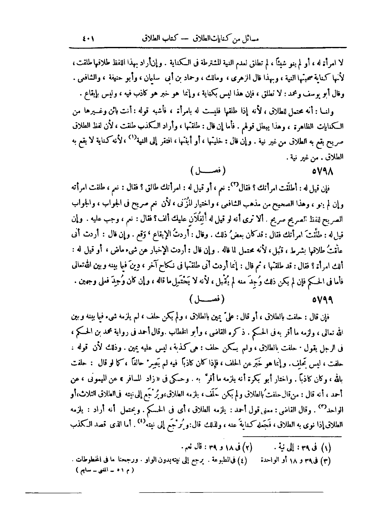 وَبِهَذَا قَالَ الزُّهْرِيُّ، وَمَالِكٌ، وَحَمَّادُ بْنُ أَبِي سُلَيْمَانَ، وَأَبُو حَنِيفَةَ، وَالشَّافِعِيُّ، وَقَالَ أَبُو يُوسُفَ، وَمُحَمَّدٌ: لَا تَطْلُقُ؛ فَإِنَّ هَذَا لَيْسَ بِكِنَايَةٍ، وَإِنَّمَا هُوَ خَبَرٌ هُوَ كَاذِبٌ فِيهِ، وَلَيْسَ بِإِيقَاعٍ. وَلَنَا، أَنَّهُ مُحْتَمِلُ الطَّلَاقِ؛ لِأَنَّهُ إذَا طَلَّقَهَا فَلَيْسَتْ لَهُ بِامْرَأَةٍ، فَأَشْبَهَ قَوْلَهُ: أَنْتِ بَائِنٌ. وَغَيْرَهَا مِنْ الْكِنَايَاتِ الظَّاهِرَةِ، وَهَذَا يُبْطِلُ قَوْلَهُمْ. فَأَمَّا إنْ قَالَ: طَلَّقْتهَا. وَأَرَادَ الْكَذِبَ طَلُقَتْ؛ لِأَنَّ لَفْظَ الطَّلَاقِ صَرِيحٌ، يَقَعُ بِهِ الطَّلَاقُ مِنْ غَيْرِ نِيَّةٍ. وَإِنْ قَالَ: خَلَّيْتهَا، أَوْ أَبَنْتهَا. افْتَقَرَ إلَى النِّيَّةِ؛ لِأَنَّهُ كِنَايَةٌ لَا يَقَعُ بِهِ الطَّلَاقُ مِنْ غَيْرِ نِيَّةٍ. (٥٨٧٥) فَصْلٌ: فَإِنْ قِيلَ لَهُ: أَطَلَّقْت امْرَأَتك؟ فَقَالَ: نَعَمْ. أَوْ قِيلَ لَهُ: امْرَأَتُك طَالِقٌ؟ فَقَالَ: نَعَمْ. طَلُقَتْ امْرَأَتُهُ، وَإِنْ لَمْ يَنْوِ.