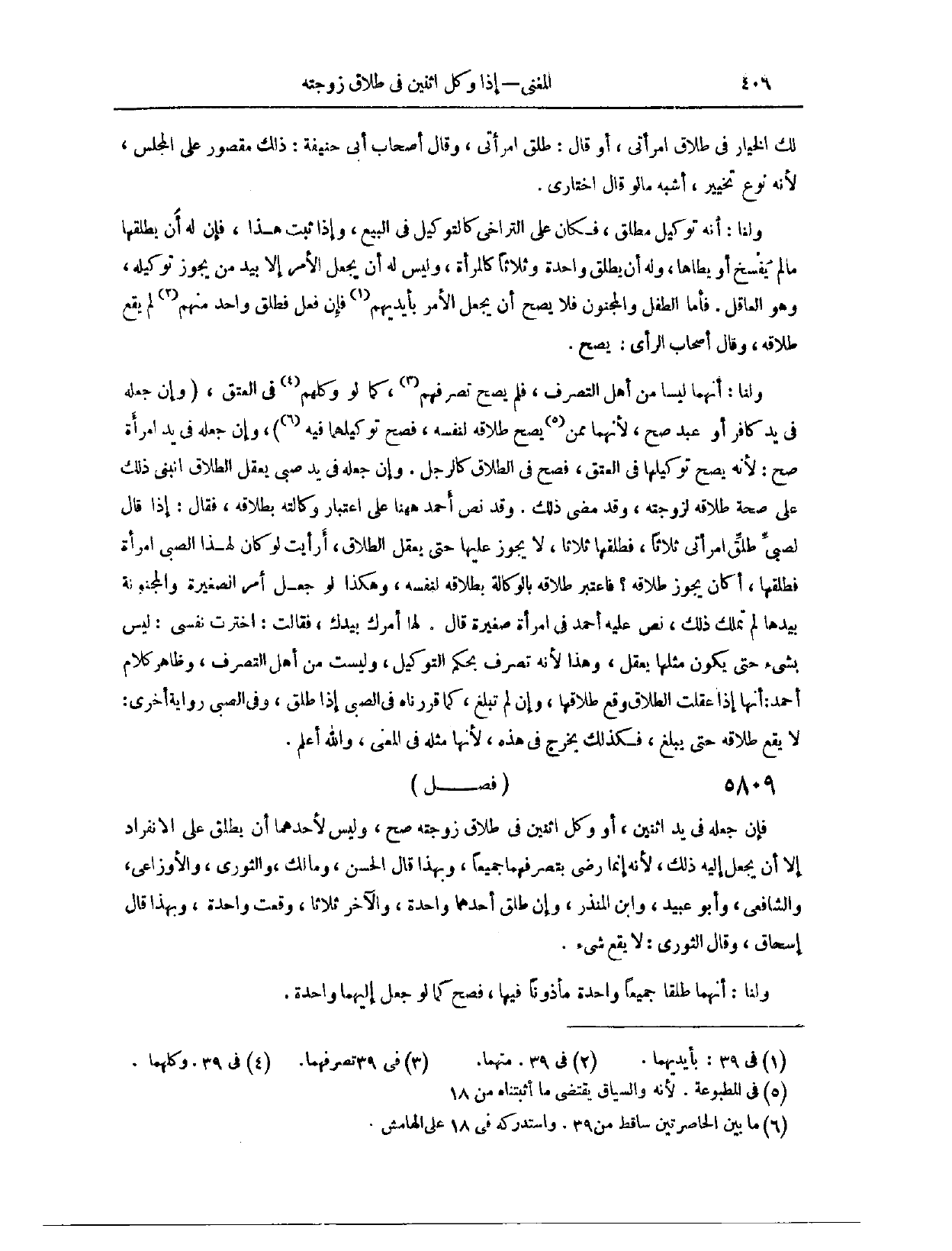 (٥٨٨٦) فَصْلٌ: فَإِنْ جَعَلَهُ فِي يَدِ اثْنَيْنِ، أَوْ وَكَّلَ اثْنَيْنِ فِي طَلَاقِ زَوْجَتِهِ، صَحَّ، وَلَيْسَ لَأَحَدِهِمَا أَنْ يُطَلِّقَ عَلَى الِانْفِرَادِ، إلَّا أَنْ يَجْعَلَ إلَيْهِ ذَلِكَ؛ لِأَنَّهُ إنَّمَا رَضِيَ بِتَصَرُّفِهِمَا جَمِيعًا. وَبِهَذَا قَالَ الْحَسَنُ، وَمَالِكٌ، وَالثَّوْرِيُّ، وَالْأَوْزَاعِيُّ، وَالشَّافِعِيُّ، وَأَبُو عُبَيْدٍ، وَابْنُ الْمُنْذِرِ. وَإِنْ طَلَّقَ أَحَدُهُمَا وَاحِدَةً، وَالْآخَرُ ثَلَاثًا، وَقَعَتْ وَاحِدَةٌ، وَبِهَذَا قَالَ إِسْحَاقُ. وَقَالَ الثَّوْرِيُّ: لَا يَقَعُ شَيْءٌ. وَلَنَا، أَنَّهُمَا طَلَّقَا جَمِيعًا وَاحِدَةً، مَأْذُونًا فِيهَا، فَصَحَّ لَوْ جَعَلَ إلَيْهِمَا وَاحِدَةً.