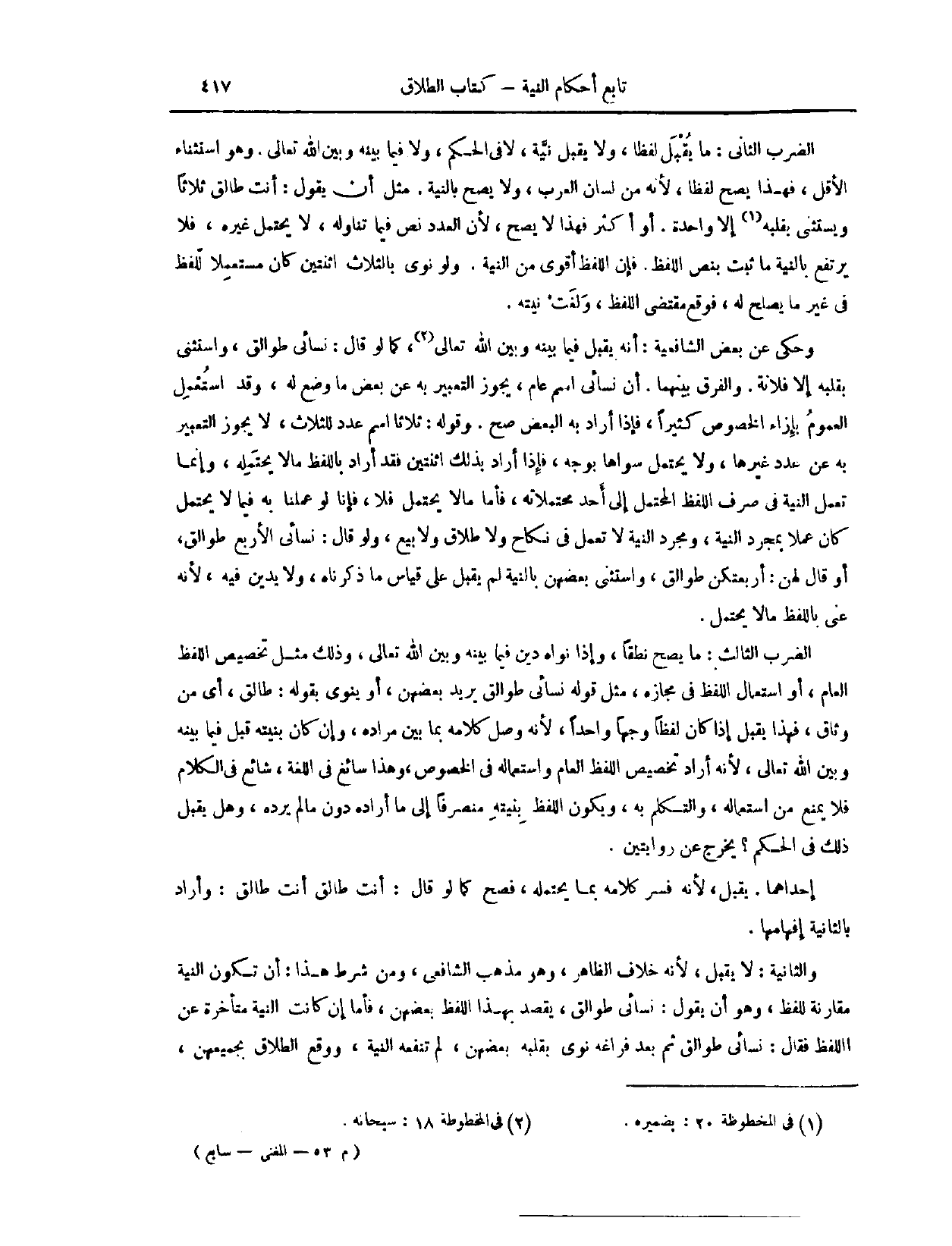 لَمْ يُقْبَلْ، عَلَى قِيَاسِ مَا ذَكَرْنَاهُ، وَلَا يَدِينِ فِيهِ؛ لِأَنَّهُ عَنَى بِاللَّفْظِ مَا لَا يَحْتَمِلُ. الضَّرْبُ الثَّالِثُ، مَا يَصِحُّ نُطْقًا، وَإِذَا نَوَاهُ دُيِّنَ فِيمَا بَيْنَهُ وَبَيْنَ اللَّهِ تَعَالَى، وَذَلِكَ مِثْلُ تَخْصِيصِ اللَّفْظِ الْعَامِ، أَوْ اسْتِعْمَالِ اللَّفْظِ فِي مَجَازِهِ، مِثْلُ قَوْلِهِ: نِسَائِي طَوَالِقُ. يُرِيدُ بَعْضَهُنَّ، أَوْ يَنْوِي بِقَوْلِهِ: طَوَالِقُ. أَيْ مِنْ وَثَاقٍ، فَهَذَا يُقْبَلُ إذَا كَانَ لَفْظًا. وَجْهًا وَاحِدًا؛ لِأَنَّهُ وَصَلَ كَلَامَهُ بِمَا بَيَّنَ مُرَادَهُ، وَإِنْ كَانَ بِنِيَّتِهِ، قُبِلَ فِيمَا بَيْنَهُ وَبَيْنَ اللَّهِ تَعَالَى؛ لِأَنَّهُ أَرَادَ تَخْصِيصَ اللَّفْظِ الْعَامِ، وَاسْتِعْمَالَهُ فِي الْخُصُوصِ، وَهَذَا سَائِغٌ فِي اللُّغَةِ، شَائِعٌ فِي الْكَلَامِ، فَلَا يُمْنَعُ مِنْ اسْتِعْمَالِهِ وَالتَّكَلُّمِ بِهِ، وَيَكُونُ اللَّفْظُ بِنِيَّتِهِ مُنْصَرِفًا إلَى مَا أَرَادَهُ، دُونَ مَا لَمْ يُرِدْهُ.