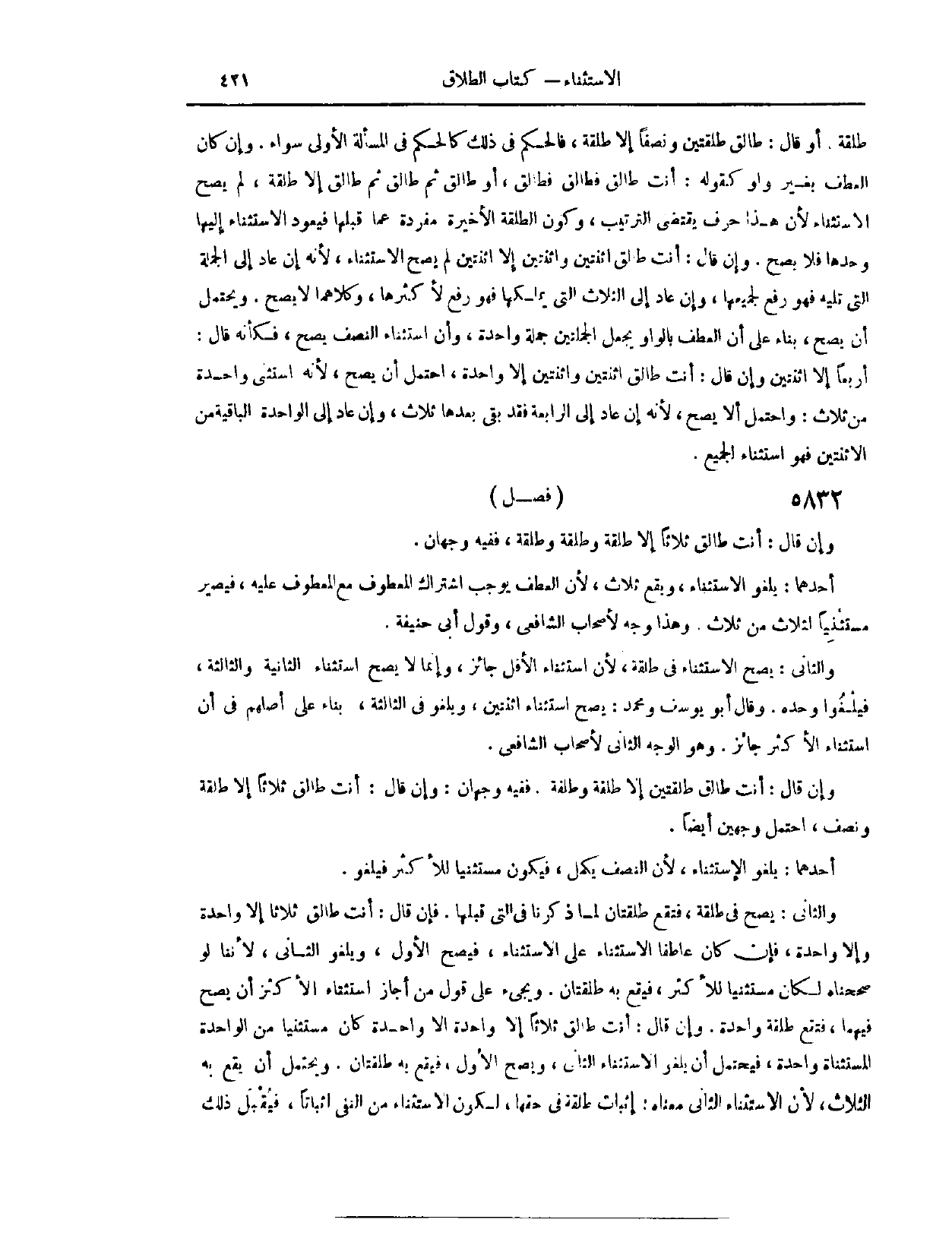 (٥٩٠٩) فَصْلٌ: وَإِنْ قَالَ: أَنْتِ طَالِقٌ ثَلَاثًا إلَّا طَلْقَةً وَطَلْقَةً وَطَلْقَةً. فَفِيهِ وَجْهَانِ؛ أَحَدُهُمَا، يَلْغُو الِاسْتِثْنَاءُ، وَيَقَعُ ثَلَاثٌ؛ لِأَنَّ الْعَطْفَ يُوجِبُ اشْتَرَاكَ الْمَعْطُوفِ مَعَ الْمَعْطُوفِ عَلَيْهِ، فَيَصِيرُ مُسْتَثْنِيًا لَثَلَاثٍ مِنْ ثَلَاثٍ. وَهَذَا وَجْهٌ لِأَصْحَابِ الشَّافِعِيِّ، وَقَوْلُ أَبِي حَنِيفَةَ. وَالثَّانِي، يَصِحُّ الِاسْتِثْنَاءُ فِي طَلْقَةٍ؛ لِأَنَّ الِاسْتِثْنَاءَ الْأَقَلَّ جَائِزٌ، وَإِنَّمَا لَا يَصِحُّ اسْتِثْنَاءُ الثَّانِيَةِ وَالثَّالِثَةِ، فَيَلْغُو وَحْدَهُ. وَقَالَ أَبُو يُوسُفَ وَمُحَمَّدٌ: يَصِحُّ اسْتِثْنَاءُ اثْنَتَيْنِ، وَيَلْغُو فِي الثَّالِثَةِ؛ بِنَاءً عَلَى أَصْلِهِمْ فِي أَنَّ اسْتِثْنَاءَ الْأَكْثَرِ جَائِزٌ. وَهُوَ الْوَجْهُ الثَّانِي لِأَصْحَابِ الشَّافِعِيِّ. وَإِنْ قَالَ: أَنْتِ طَالِقٌ طَلْقَتَيْنِ إلَّا طَلْقَةً وَطَلْقَةً. فَفِيهِ الْوَجْهَانِ.