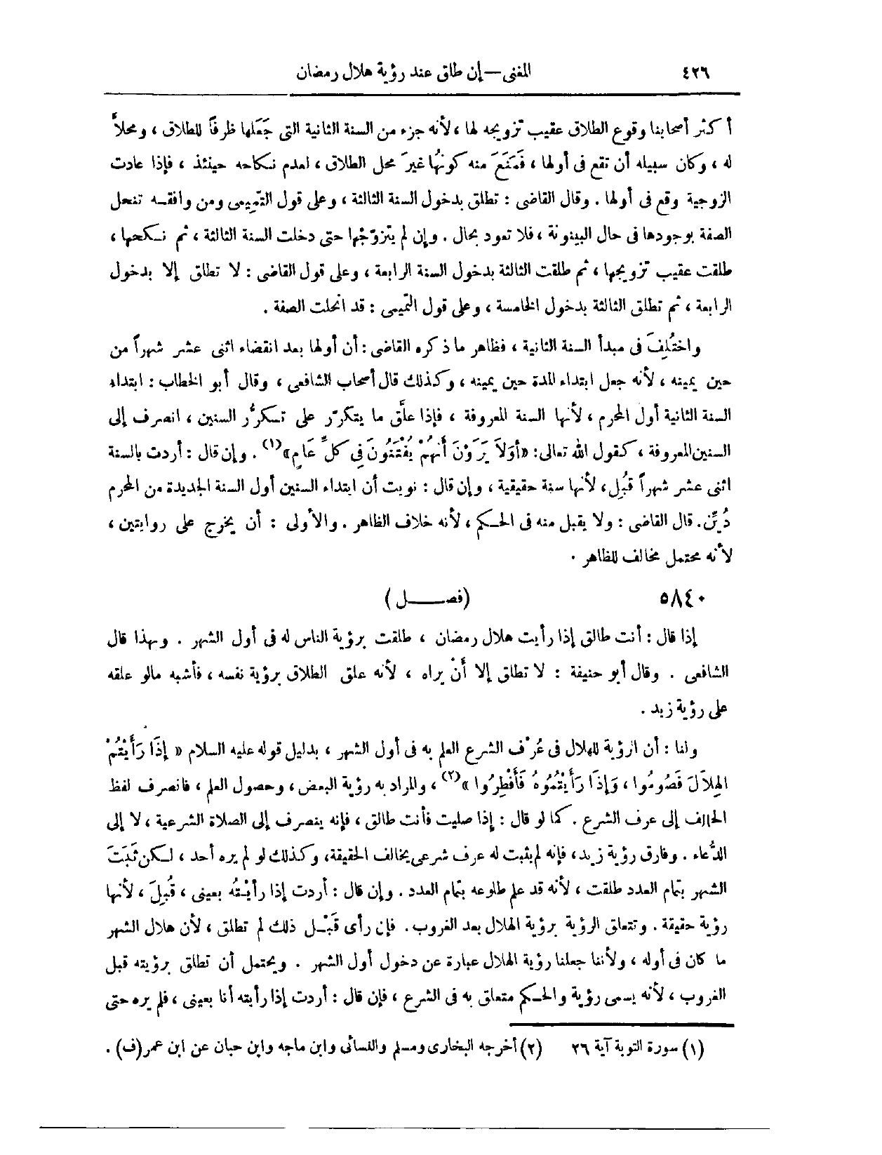 (٥٩١٨) فَصْلٌ: إذَا قَالَ: أَنْتِ طَالِقٌ إذَا رَأَيْتُ هِلَالَ رَمَضَانَ طَلَقَتْ بِرُؤْيَةِ النَّاسِ لَهُ فِي أَوَّلِ الشَّهْرِ. وَبِهَذَا قَالَ الشَّافِعِيُّ. وَقَالَ أَبُو حَنِيفَةَ: لَا تَطْلُقُ إلَّا أَنْ يَرَاهُ؛ لِأَنَّهُ عَلَّقَ الطَّلَاقَ بِرُؤْيَةِ نَفْسِهِ، فَأَشْبَهَ مَا لَوْ عَلَّقَهُ عَلَى رُؤْيَةِ زَيْدٍ. وَلَنَا، أَنَّ الرُّؤْيَةَ لِلْهِلَالِ فِي عُرْفِ الشَّرْعِ الْعِلْمُ بِهِ فِي أَوَّلِ الشَّهْرِ؛ بِدَلِيلِ قَوْلِهِ - عَلَيْهِ السَّلَامُ -: «إذَا رَأَيْتُمْ الْهِلَالِ فَصُومُوا، وَإِذَا رَأَيْتُمُوهُ فَأَفْطِرُوا» . وَالْمُرَادُ بِهِ رُؤْيَةُ الْبَعْضِ، وَحُصُولُ الْعِلْمِ، فَانْصَرَفَ لَفْظُ الْحَالِفِ إلَى عُرْفِ الشَّرْعِ، كَمَا لَوْ قَالَ: إذَا صَلَّيْتُ فَأَنْتِ طَالِقٌ. فَإِنَّهُ يَنْصَرِفُ إلَى الصَّلَاةِ الشَّرْعِيَّةِ، لَا إلَى الدُّعَاءِ. وَفَارَقَ رُؤْيَةَ زَيْدٍ، فَإِنَّهُ لَمْ يَثْبُتْ لَهُ عُرْفٌ شَرْعِيٌّ يُخَالِفُ الْحَقِيقَةَ.